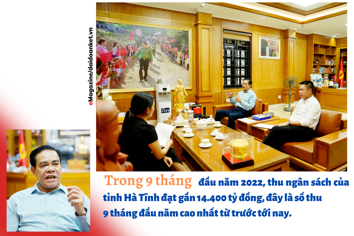 - Trong 9 tháng đầu năm 2022, thu ngân sách của tỉnh Hà Tĩnh đạt gần 14.400 tỷ đồng, đây là số thu 9 tháng đầu năm cao nhất từ trước tới nay. Thu ngân sách 9 tháng đầu năm 2022 đã đạt 88% dự toán, tăng 23% so với cùng kỳ năm 2021. Hoạt động du lịch dịch vụ phục hồi nhanh, sản xuất nông nghiệp ổn định, xuất khẩu đạt hơn 1,3 tỷ USD, giải quyết việc làm mới cho gần 19.000 lao động. Gần 1.100 doanh nghiệp mới được thành lập, tăng 39% so với cùng kỳ năm 2021, đạt số lượng thành lập mới cao nhất từ trước tới nay.