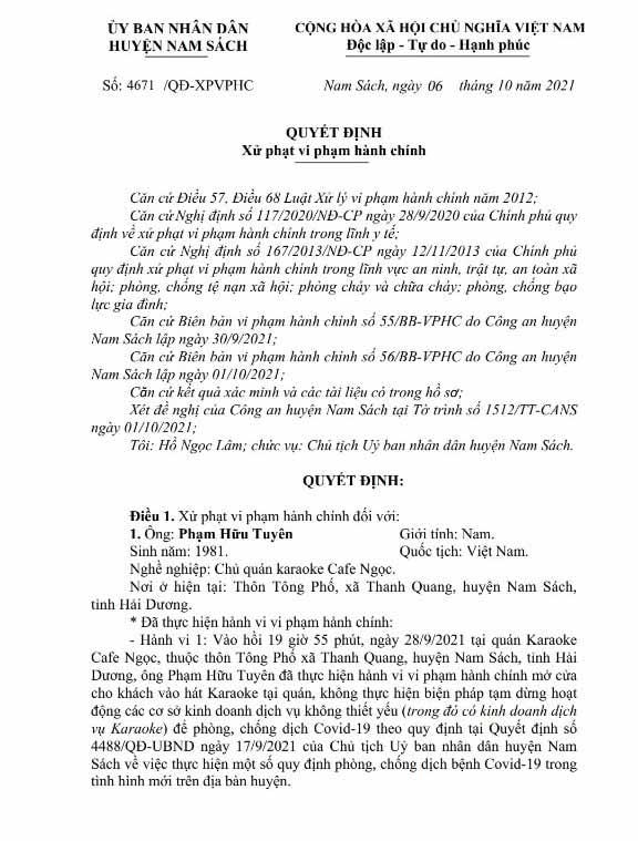 Ngày 6/10, Chủ tịch UBND huyện Nam Sách đã ra quyết định xử phạt vi phạm hành chính chủ quán karaoke, cafe Ngọc với số tiền 20 triệu đồng do vi phạm công tác phòng chống dịch covid-19 và 10 triệu đồng vì hành vi để người khác lợi dụng sử dụng trái phép chất ma tuý tại quán.