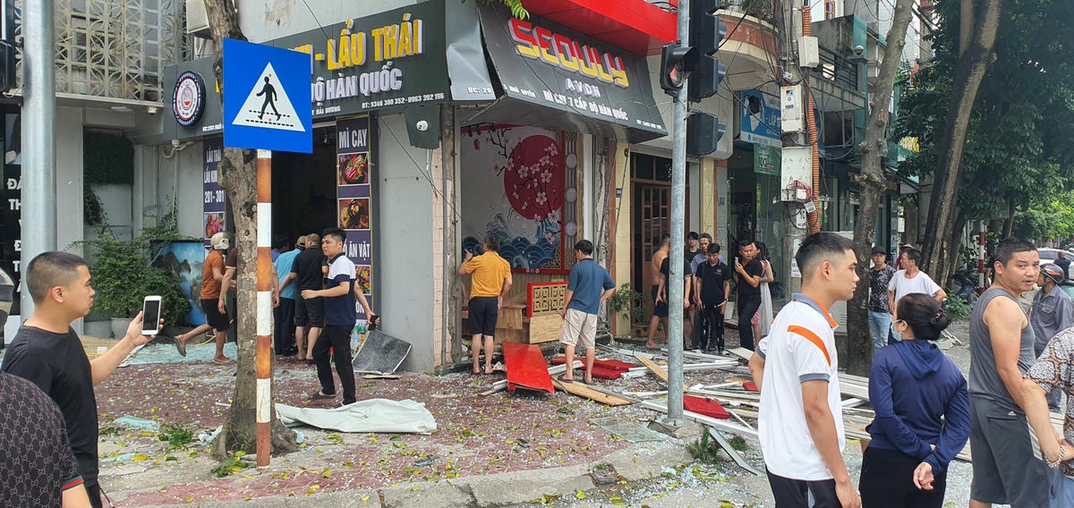 Vụ nổ xuất phát từ gian bếp của quán ăn khiến cửa kính tầng 1 của quán vỡ vụn, văng ra vỉa hè và lòng đường, 2 nhân viên của quán bị bỏng và 3 người dân đi đường bị thương do mảnh kính văng vào người.