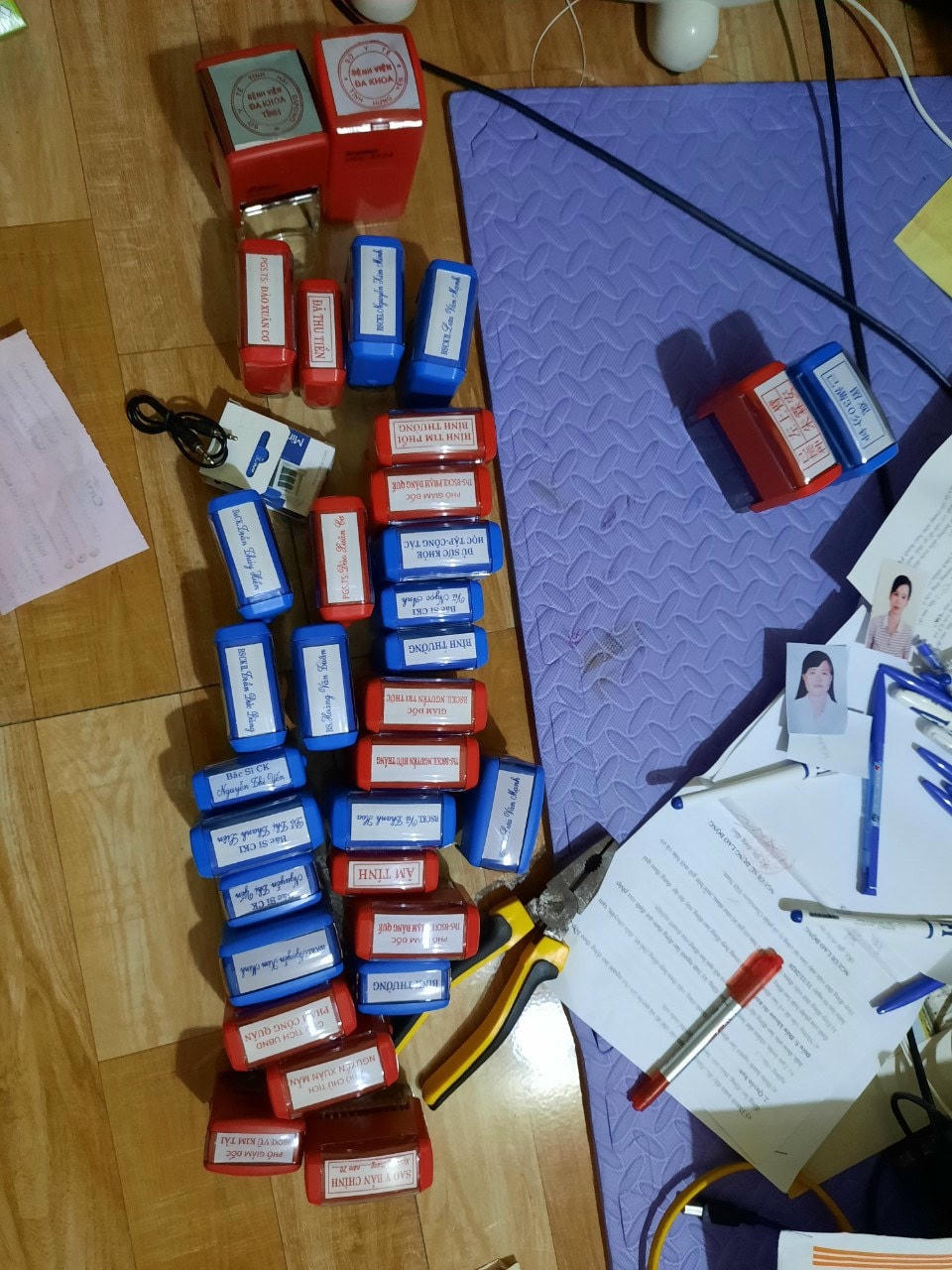 Lực lượng chức năng đã thu giữ 33 con dấu giả các loại, 83 tờ giấy khám sức khỏe giả của Bệnh viện Đa khoa tỉnh Hải Dương; 109 tờ giấy khám sức khỏe giả của Bệnh viện Đa khoa tỉnh Hưng Yên; 1 giấy khám sức khỏe phần thông tin của người khám bệnh và chữ ký, hình dấu tại mục "người kết luận" bỏ trống…
