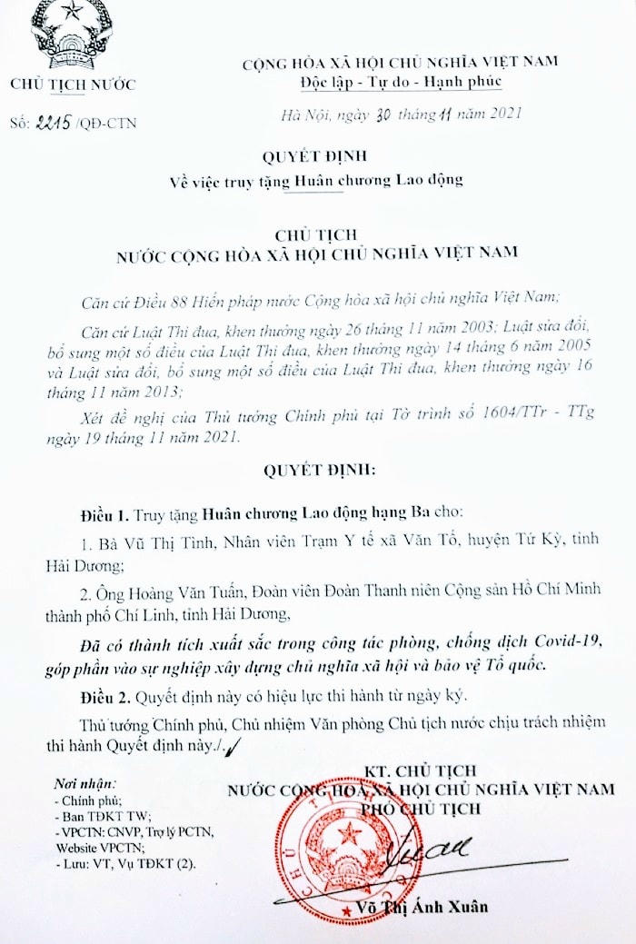 Ngày 30/11, Phó Chủ tịch nước Võ Thị Ánh Xuân đã ký quyết định số 2215/QĐ-CTN về việc truy tặng Huân chương Lao động hạng Ba cho bà Vũ Thị Tình và ông Hoàng Văn Tuấn vì có thành tích xuất sắc trong công tác phòng chống dịch Covid-19.