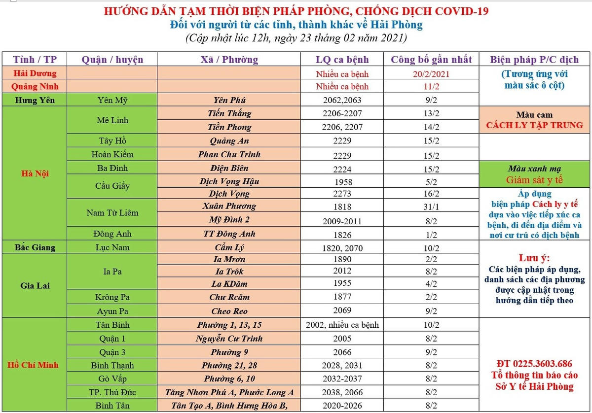 Cũng trong ngày, Sở Y tế TP Hải Phòng đã ban hành Hướng dẫn tạm thời biện pháp phòng chống dịch Covid-19 đối với người từ các tỉnh, thành khác về thành phố như sau (thông tin cập nhật vào 12h ngày 23/2/2021).