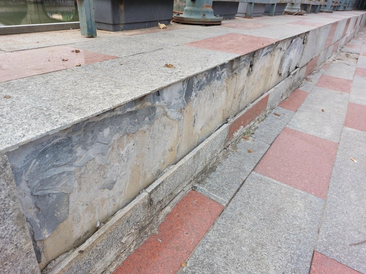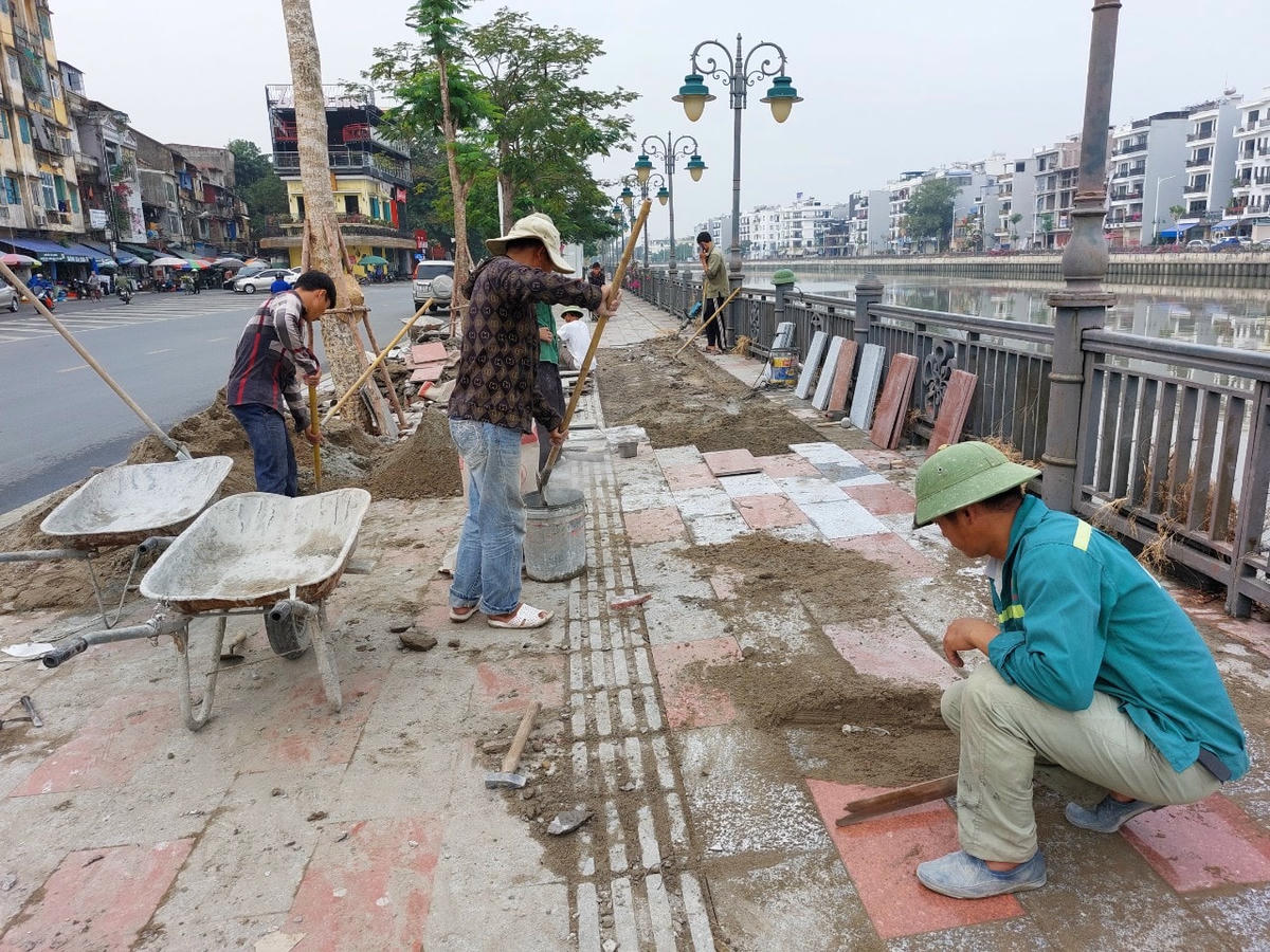 Đơn vị thi công đang tiến hành sửa sang, khắc phục những đoạn bong tróc trên tuyến vỉa hè sông Tam Bạc để nghiệm thu.