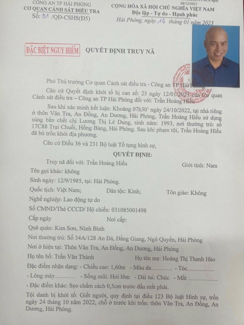 Ngày 2/2, Công an TP Hải Phòng đã ra quyết định truy nã bị can Trần Hoàng Hiếu (37 tuổi, ở phường Đằng Giang, quận Ngô Quyền) về tội Giết người.