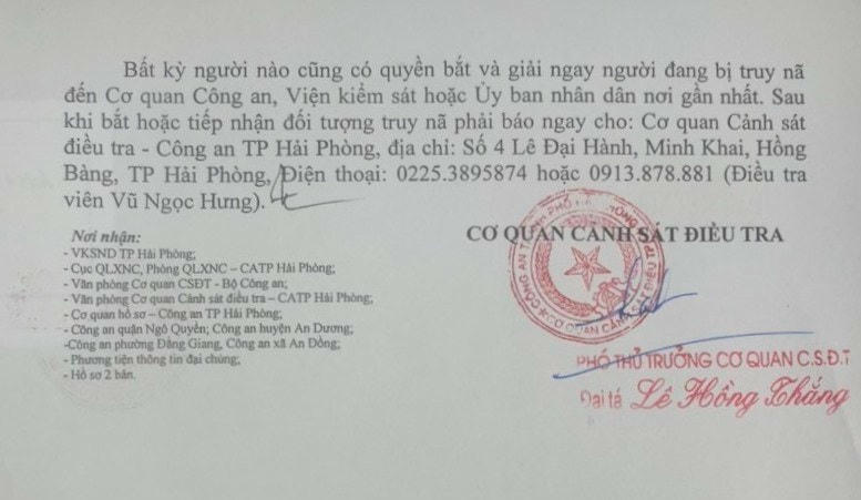 Bất kỳ người nào cũng có quyền bắt và giải ngay người đang bị truy nã đến Cơ quan Công an, Viện kiểm sát hoặc Ủy ban nhân dân nơi gần nhất. Sau khi bắt hoặc tiếp nhận đối tượng truy nã phải báo ngay cho: Cơ quan Cảnh sát điều tra - Công an TP Hải Phòng, địa chỉ: số 4 Lê Đại Hành, phường Minh Khai, quận Hồng Bàng, TP Hải Phòng, điện thoại: 0225.3895874 hoặc 0913.878.881 (Điều tra viên Vũ Ngọc Hưng).