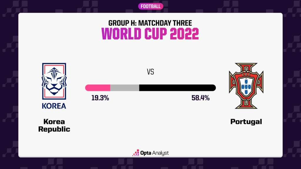 Dù Bồ Đào Nha không cần giành chiến thắng bằng mọi giá, nhưng quá nhiều yếu tố ủng hộ khiến họ được mô hình dự đoán Opta đánh giá cao, với cơ hội chiến thắng chiếm 58,4%. Con số này với Hàn Quốc là 19,3%.