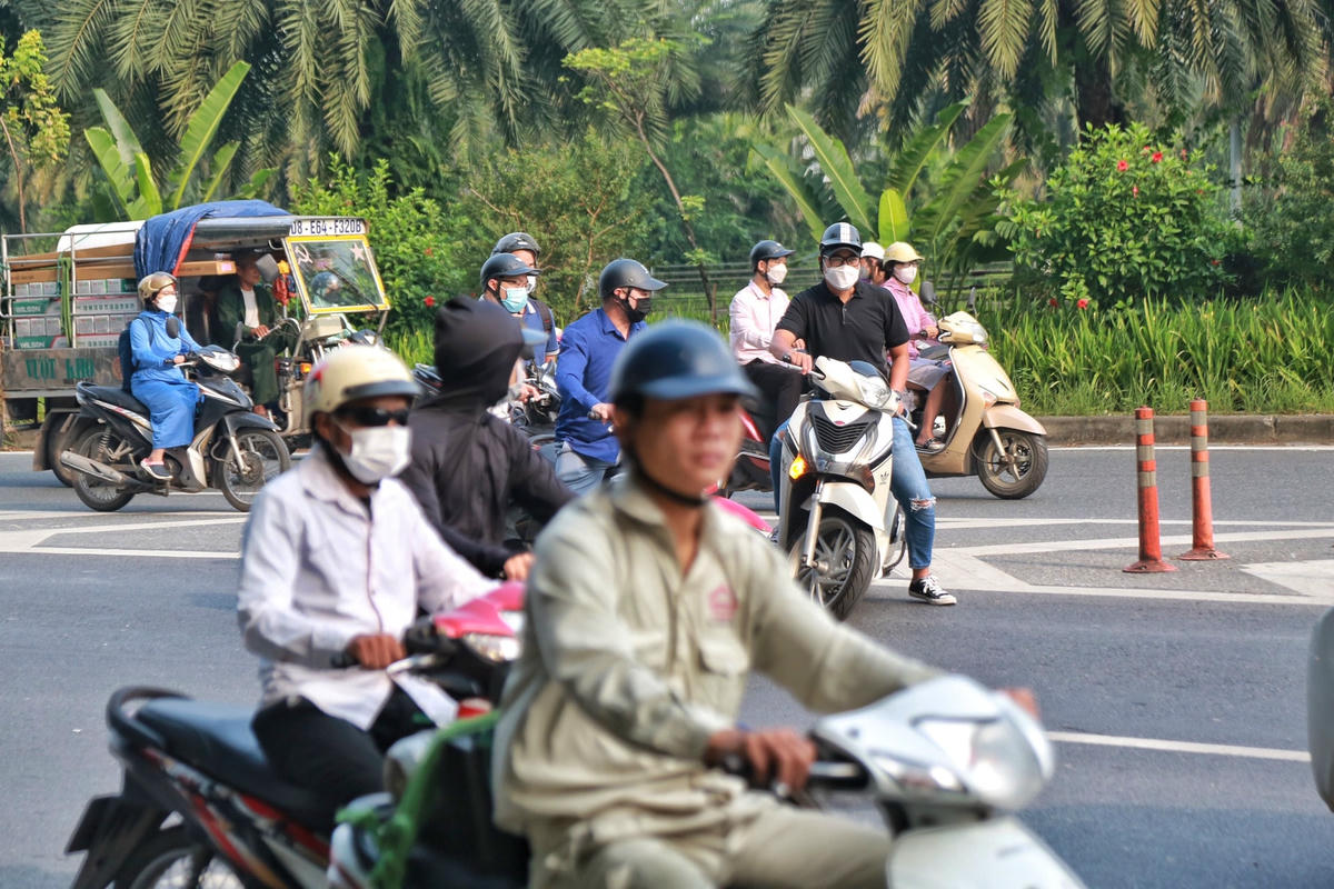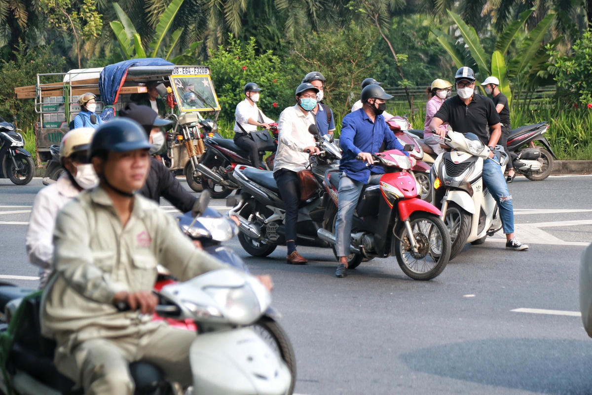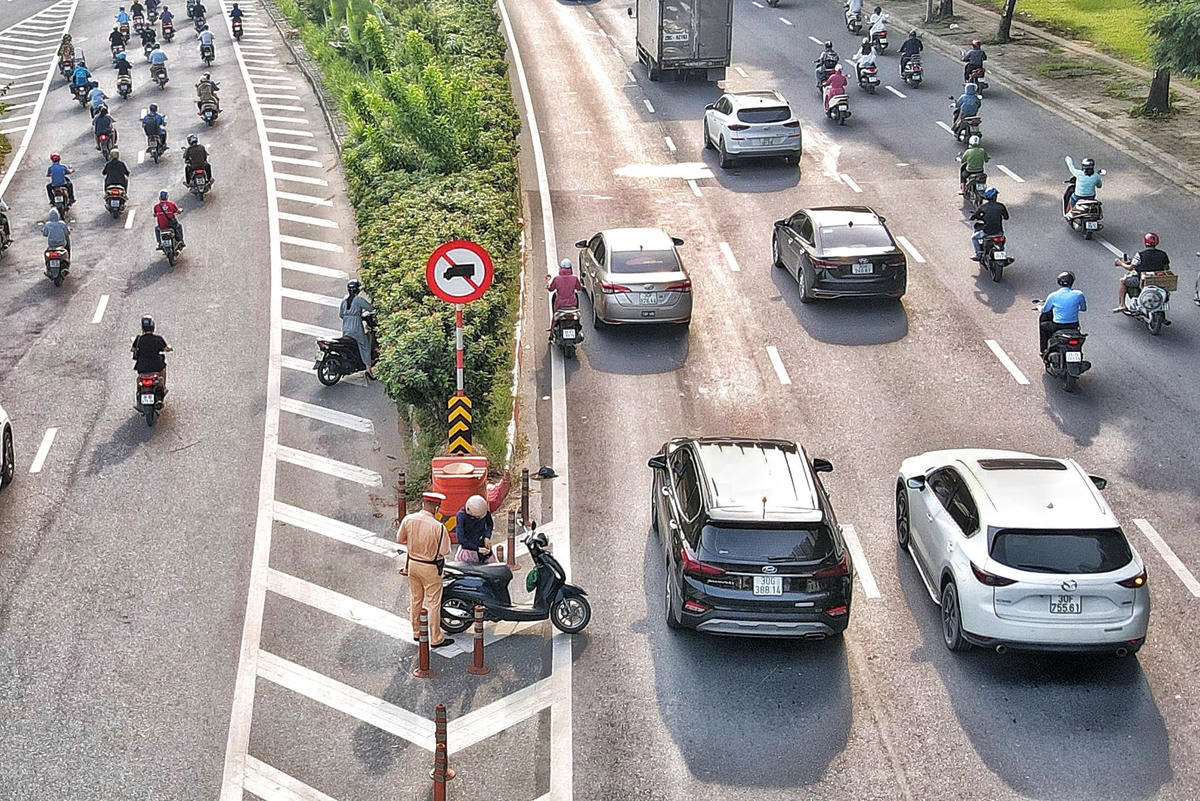 Hàng dài xe máy nối đuôi nhau đi ngược chiều tại khu vực gần hầm chui Trung Hòa