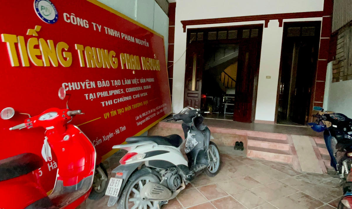 Theo quảng cáo trên fanpage của Cơ sở tiếng Trung P.N., tìm đến địa chỉ số 54 Hà Huy Tập (thị trấn Cẩm Xuyên) nhưng cơ sở này đã đóng cửa, bảng biển quảng cáo cũng đã được tháo dỡ từ lúc nào. Nơi đây chỉ còn lại một căn nhà 2 tầng đóng kín cửa.