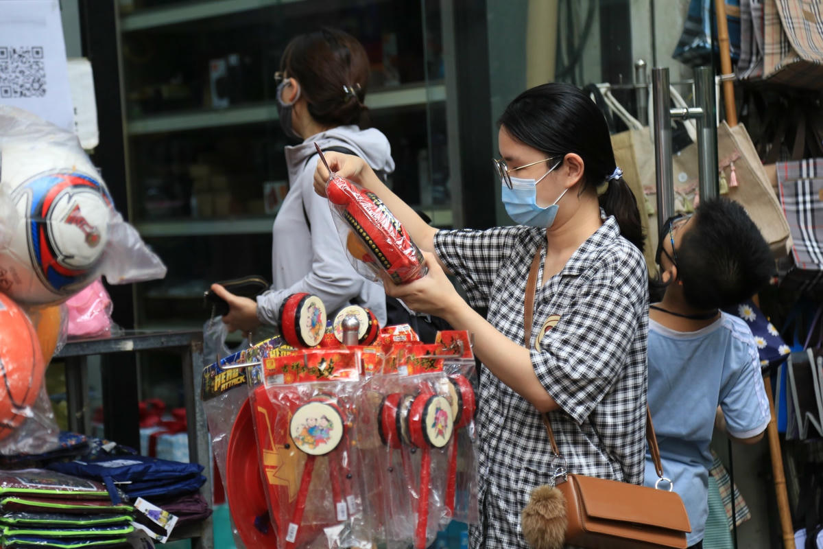 Do tình hình dịch bệnh đang có diễn biến phức tạp, thay vì dẫn con nhỏ lên Hàng Mã vui chơi, mua đồ Trung thu như mọi năm, chị Đào Thị Thu (30 tuổi, Nguyễn Khánh Toàn, Cầu Giấy) và chồng quyết định dẫn 2 con ra cửa hàng văn phòng phẩm trên đường Tô Hiệu mua đèn ông sao.