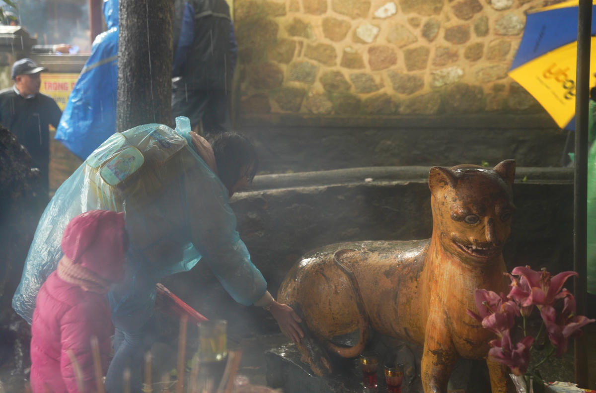 Theo ghi nhận của PV Báo Đại Đoàn Kết, sáng 27/1 (tức ngày mồng 6 tháng Giêng năm Quý Mão) dù đã là ngày cuối kỳ nghỉ Tết Nguyên đán nhưng nhiều du khách vẫn đi lễ tại chùa Hương Tích để cầu may.Ngay từ sáng sớm, thời tiết tại chùa Hương Tích trời lạnh kèm theo gió to, mưa dày hạt nhưng du khách vẫn đội mưa để đi lễ đầu năm.Hàng năm vào mùa lễ hội đầu năm, chùa Hương Tích đón hàng chục nghìn du khách thập phương đến tham quan.Sau khi mua vé, du khách di chuyển bằng xe điện vào khu vực cáp treo để lên chùa.Một số người lựa chọn đi bộ với quãng đường hơn 5 km.Sau khi di chuyển bằng xe điện, du khách sẽ được đưa đến địa điểm cáp treo để lên chùa.Hàng ngàn du khách đội mưa nối đuôi nhau lên xuống của chùa Hương Tích.“Năm nào gia đình tôi cũng vào chùa Hương Tích để vãn cảnh, cầu may. Sáng nay, có mặt tại chùa vào lúc 4h sáng và gặp phải thời tiết mưa lớn nhưng gia đình tôi vẫn theo các cung đường để lên chùa làm lễ, vì đây là truyền thống hàng năm của gia đình”, chị Hoàng Thị Mai (trú tại Đống Đa, Hà Nội) chia sẻ.Phần lớn du khách cốt cầu sức khỏe cho bản thân và gia đình. Niềm tin và ước vọng đầu năm cũng là tâm lý chung của nhiều người trẩy hội.Du khách thắp hương tại chùa Hương Tích nhằm cầu sức khoẻ, công việc thuận lợi và sự may mắn cho cả năm.Khi du khách đến tham quan chùa Hương Tích sẽ không bỏ qua việc xoa tay vào tượng hổ rồi xoa lên người để cầu mong sức khỏe và may mắn trong năm mới.Mặc dù mưa lớn nhưng du khách muôn phương vẫn rất đông đúc và phấn khởi với chuyến hành hương đầu năm mới. Theo kế hoạch, vào sáng nay (27/1) UBND huyện Can Lộc phối hợp cùng Sở VH-TT&DL tỉnh Hà Tĩnh sẽ tổ chức Lễ khai hội chùa Hương Tích, mở đầu năm du lịch Hà Tĩnh 2023. Tuy nhiên, do thời tiết gió to, mưa lớn nên chương trình Lễ khai hội chùa Hương Tích sẽ được diễn ra vào 8h sáng ngày 29/1 (tức ngày 8 tháng Giêng năm Quý Mão).