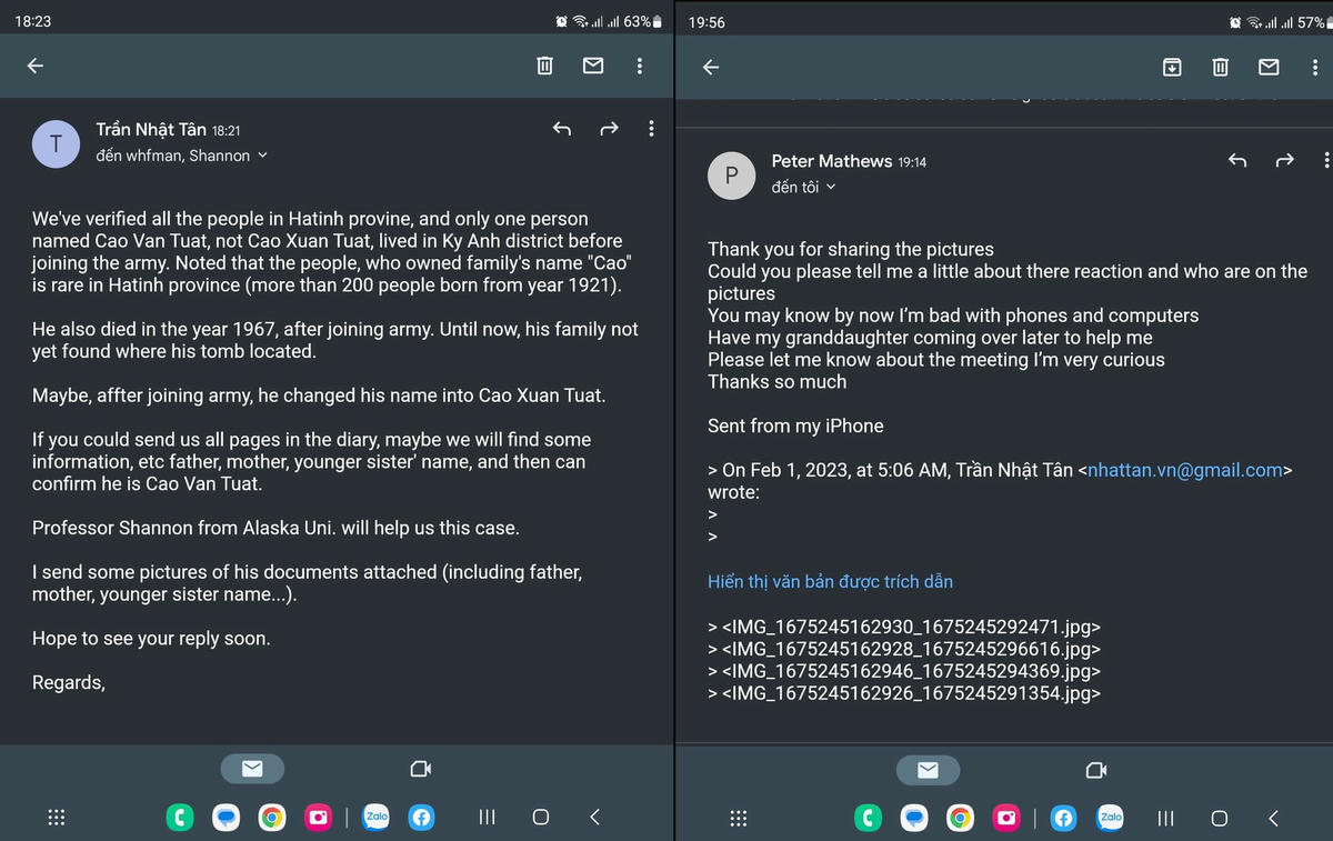 Trong một diễn biến khác, nhận được thông tin, chiều 1/2 đoàn công tác Hà Tĩnh tìm đến gia đình liệt sĩ Cao Văn Tuất để nhận định là thân nhân của người lính Việt mình đang tìm kiếm, ông Peter Mathews đã thức xuyên đêm, liên tục gửi email, chờ đợi thông tin phản hồi.