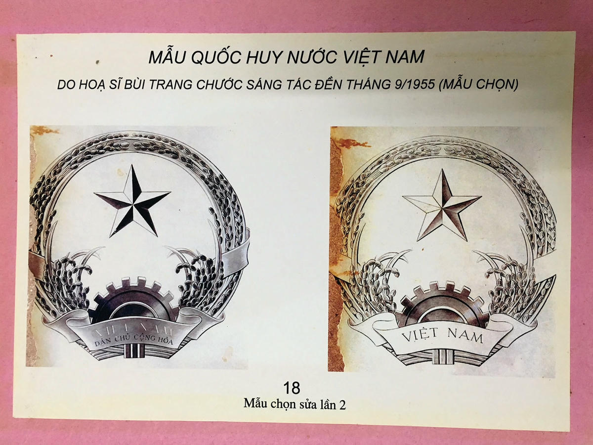 Sự việc thu hút sự chú ý của nhiều cơ quan có thẩm quyền. Thân nhân của họa sĩ Bùi Trang Chước (Bà Nguyễn Thị Thục - vợ họa sĩ Bùi Trang Chước, con gái Minh Thủy, con rể họa sĩ Lê Lai…) cung cấp thêm cho Trung tâm lưu trữ Quốc gia III và cơ quan chức năng 94 bản vẽ, 50 bản màu và 44 bản chì của họa sĩ Bùi Trang Chước. Từ những bản vẽ này, họa sĩ Bùi Trang Chước đã chắt lọc thành 15 mẫu Quốc huy. Các mẫu tuy đa dạng nhưng thống nhất về ý tưởng, tập trung về chi tiết, hình tượng như ngôi sao, bông lúa, dải lụa, bánh xe công nghiệp… 15 mẫu này đã được gửi lên Bộ Tuyên truyền để trình lên xin ý kiến. Hồ Chủ tịch đã chọn mẫu số 1 trong 15 mẫu nhưng góp ý thay hình tượng cái đe trong bản vẽ tượng trưng cho tiểu thủ công nghiệp bằng bánh xe tượng trưng cho nền công nghiệp hiện đại. Trên cơ sở góp ý, họa sĩ Bùi Trang Chước đã chỉnh sửa. Bản sau cùng được gọi là bản số 18.