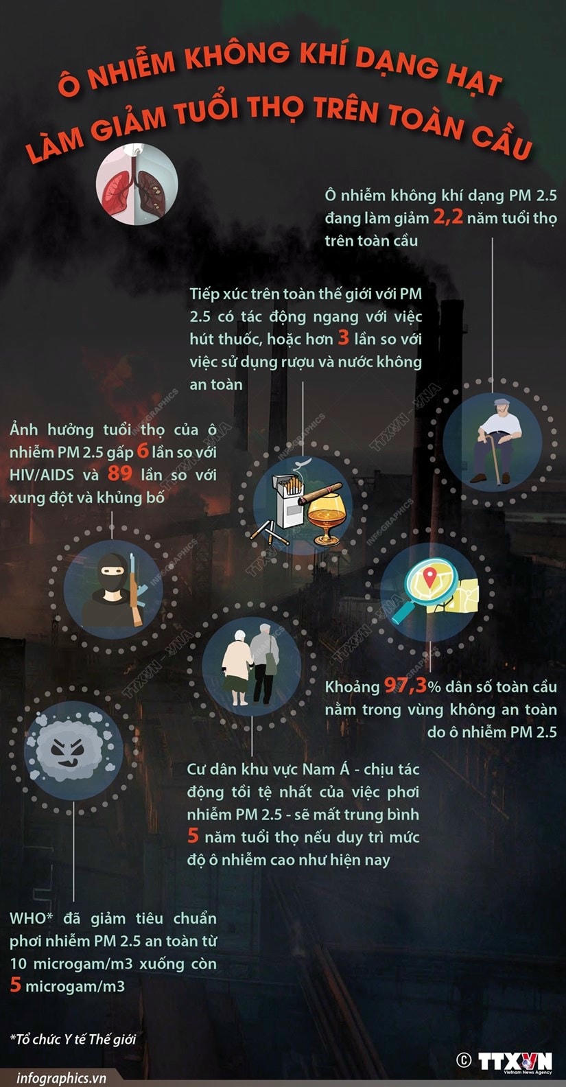 Ảnh hưởng tới tuổi thọ của ô nhiễm hạt mịn PM 2.5 cao gấp 6 lần so với HIV/AIDS và cao gấp 89 lần so với xung đột và khủng bố gây ra.