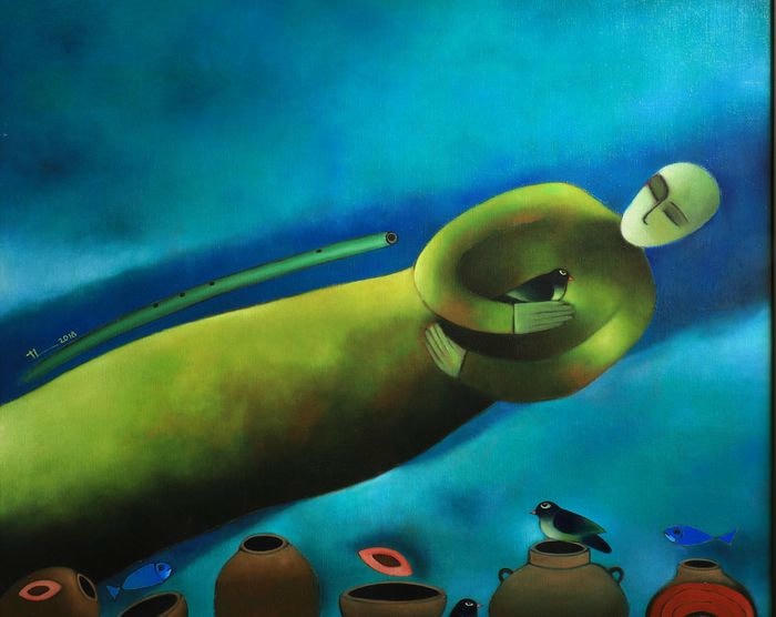 Có một bức tranh trong triển lãm “Người thổi sáo” của tôi tổ chức đầu năm 2021 vẽ một người có con rắn ngủ trên tay và có 3 chiếc bình gốm. 1 chiếc đựng nước, 1 chiếc đựng hạt giống và 1 chiếc đựng chữ. Mọi dân tộc phải có đủ 3 chiếc bình đó mới xây dựng được dân tộc của mình.