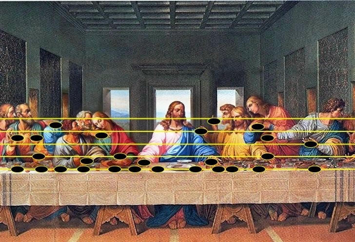 Đó không phải là bí ẩn duy nhất của "Bữa ăn tối cuối cùng". Bàn tay của Đấng Christ và các sứ đồ, cùng với những ổ bánh mì trên bàn, tạo thành một thứ có thể được đọc như một ký hiệu âm nhạc. Sau khi thử nghiệm, nó nghe giống như một giai điệu ngắn.