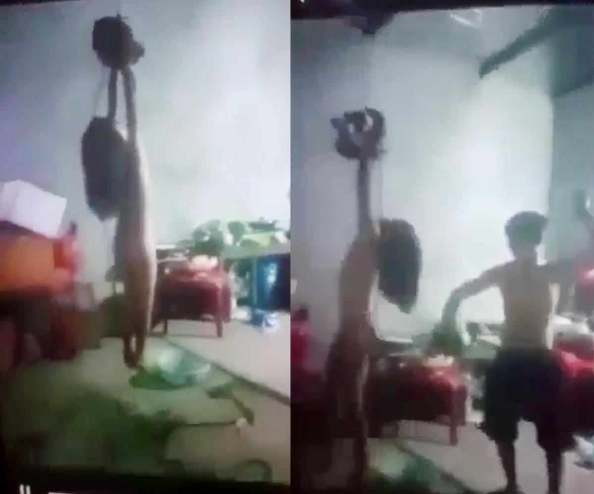 Ngày hôm sau, lúc về đến nhà, cháu N. bị anh T. bắt cởi hết quần áo rồi dùng áo quấn quanh tay, buộc dây thừng treo lên xà nhà.