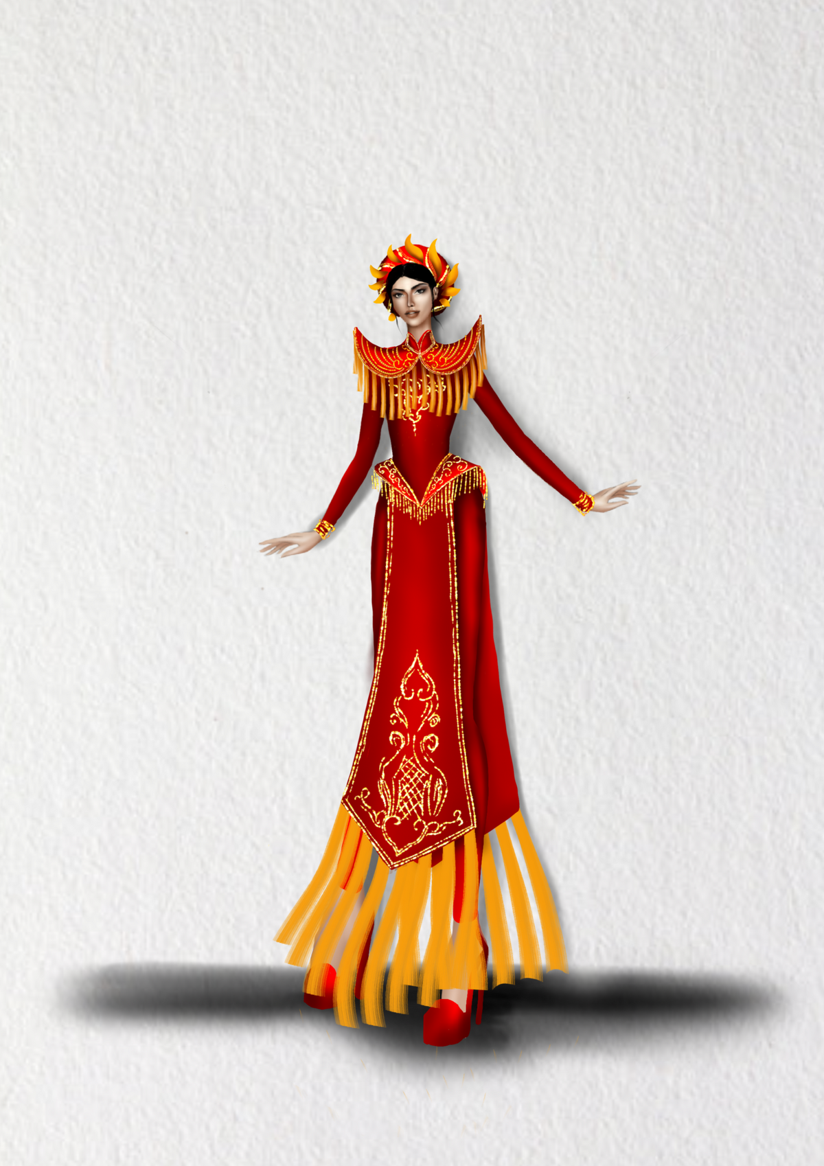 Đặc biệt, trong bộ tràng phục này, anh đã sử dụng công nghệ thiết kế 3D tạo hình hai chú chim thiên nga e ấp ôm trọn phần ngực đầy tinh tế. Chiếc váy gợi cảm sẽ được đính kết từ những viên đá quý lấp lánh kết hợp cùng sự uyển chuyển của chất liệu bay bổng ở phần thân dưới, tạo nên vẻ thanh lịch trong mỗi bước đi. Điểm nhấn của bộ trang phục là phần tà bay bổng, dễ tạo hiệu ứng tốt khi trình diễn trên sân khấu, toát lên vẻ kiêu sa và quyền lực.