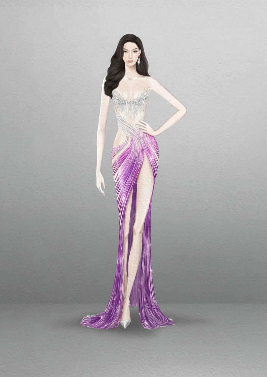 Bên cạnh đó, bộ trang phục dạ hội cho đêm chung kết cũng là một sáng tạo độc đáo, lấy cảm hứng từ ánh hoàng hôn tím trên bờ biển tại quê hương Khánh Hòa của Hoa hậu Hoàng Phương.