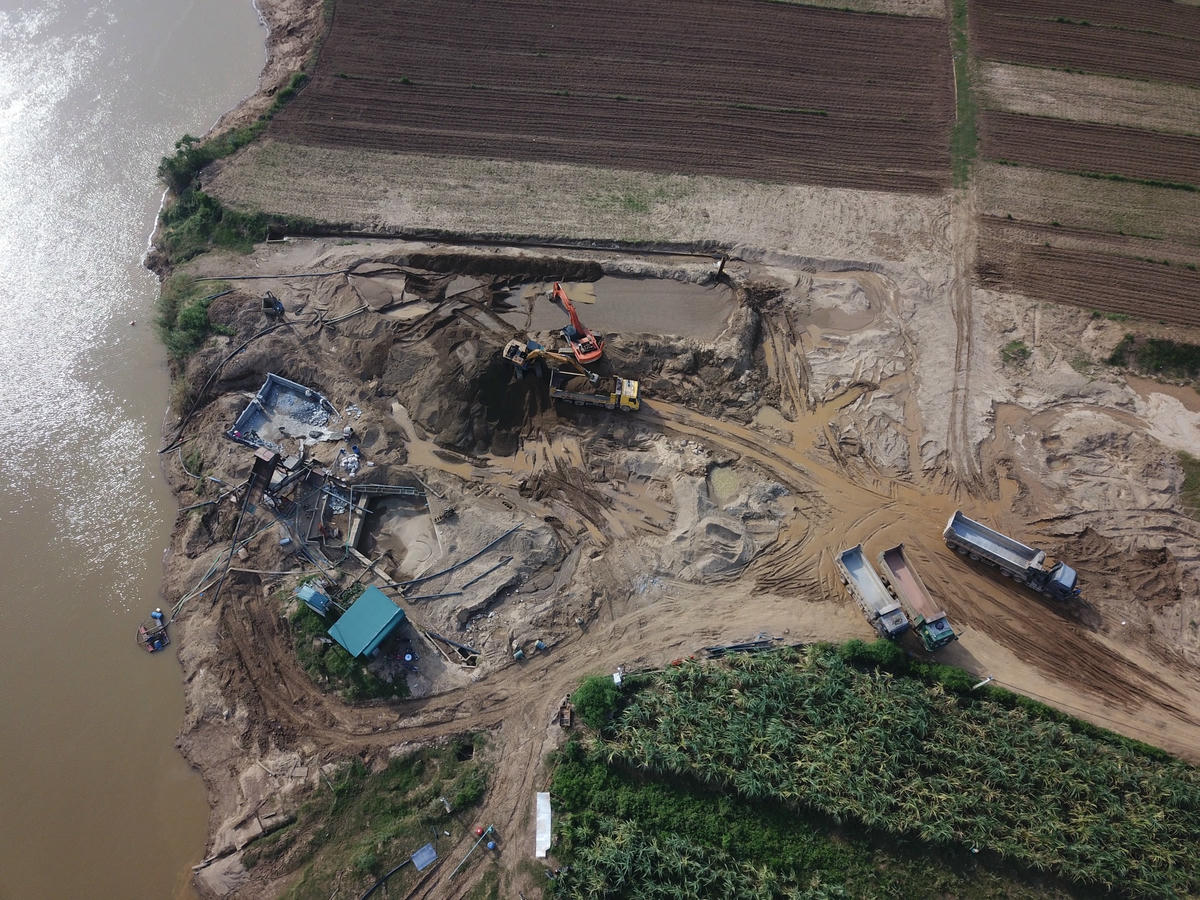 Cụ thể, vào ngày 28/9 và ngày 14/10, tại khúc sông Bưởi gần mỏ cát, chúng tôi ghi nhận tàu đang hút cát giữa lòng sông. Theo quan sát, các thuyền này có hệ thống sàng lọc, chỉ lấy cát, còn sỏi và đá cùng các tạp chất khác được thải lại ngay xuống sông. Sau khi hút đầy, các thuyền chở cát trở về và bơm lên bãi tập kết của DN Đại An. Có 2 vòi bơm cát từ thuyền lên, nước cát sẽ chảy ra 1 rãnh nhỏ rồi quay ngược lại với dòng sông, không qua bất kỳ một quy trình lắng lọc nào. Quan sát từ trên cao, chúng tôi cũng nhận thấy mỏ này không hề có tường bao, không có hệ thống thu gom nước thải.