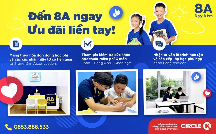 Để được hỗ trợ thuận tiện, nhanh chóng, tại 5 cửa hàng Circle K có cơ sở của 8A Dạy Kèm, phụ huynh và học viên Apax mang theo hóa đơn đóng học phí và các xác nhận giấy tờ có liên quan từ Trung tâm Apax Leaders. Chương trình có thể kết thúc trước thời hạn thông báo, phụ thuộc vào sức chứa của từng cơ sở 8A, tọa lạc thuận tiện tại các cửa hàng Circle K tại 2 cơ sở ở quận 7, quận 2, quận Bình Thạnh, Quận Gò Vấp.