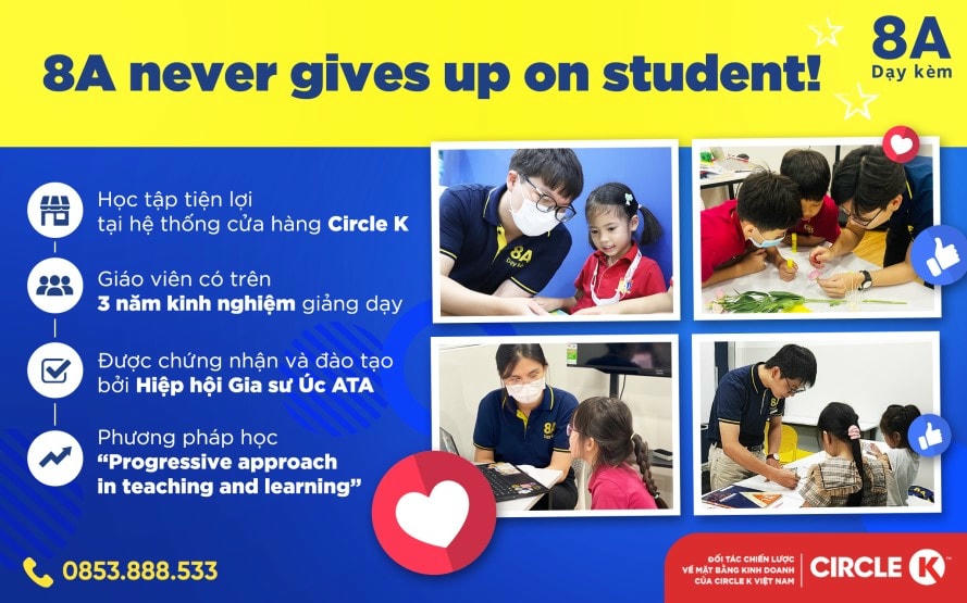Hệ thống trường song ngữ 8A chuyên dạy kèm theo chương trình song ngữ, quốc tế và chương trình của Bộ GDĐT Việt Nam tại hệ thống cửa hàng Circle K, TP Hồ Chí Minh. Trong những năm qua, Hệ thống đã được chứng nhận và đào tạo bài bản phương pháp giảng dạy độc quyền bởi Hiệp hội gia sư Úc ATA (Australian Tutoring Association).