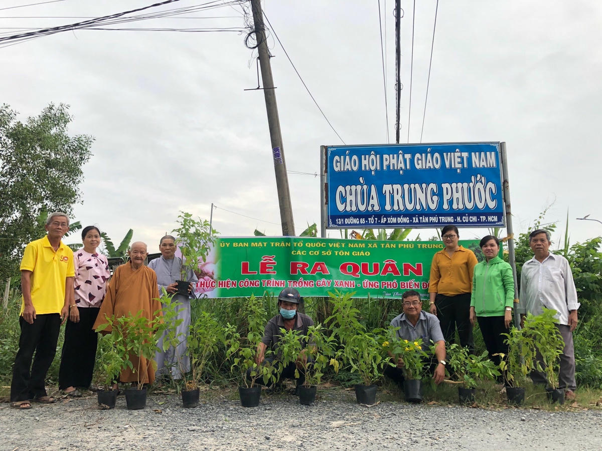 Bà Trương Thị Mỹ Hạnh - Phó Chủ tịch Ủy ban MTTQ huyện Củ Chi cho hay, năm 2019, trên cơ sở Kế hoạch phối hợp với Phòng Tài nguyên và Môi trường huyện và các tổ chức tôn giáo trên địa bàn về bảo vệ môi trường (BVMT) và ứng phó với biến đổi khí hậu, MTTQ huyện đã cùng các cơ sở tôn giáo trên địa bàn vận động người dân tham gia các hoạt động BVMT. Và mô hình “Mỗi cơ sở tôn giáo - một mảng xanh bảo vệ môi trường” được ra đời. Từ đó, các cơ sở tôn giáo đã đồng thuận và thực hiện các công trình BVMT, cụ thể như: Chương “Trao cây xanh” cho các hộ dân và đồng bào phật tử trồng tại nhà; duy trì “Tuyến đường hoa chuông vàng”, do các cơ sở tôn giáo trồng và chăm sóc; “Xanh hóa hàng rào” tại các cơ sở tôn giáo... Triển khai và duy trì các hoạt động trồng và chăm sóc cây xanh trên các tuyến đường; duy trì chăm sóc các tuyến đường, trụ cờ xanh - sạch - thân thiện với môi trường.