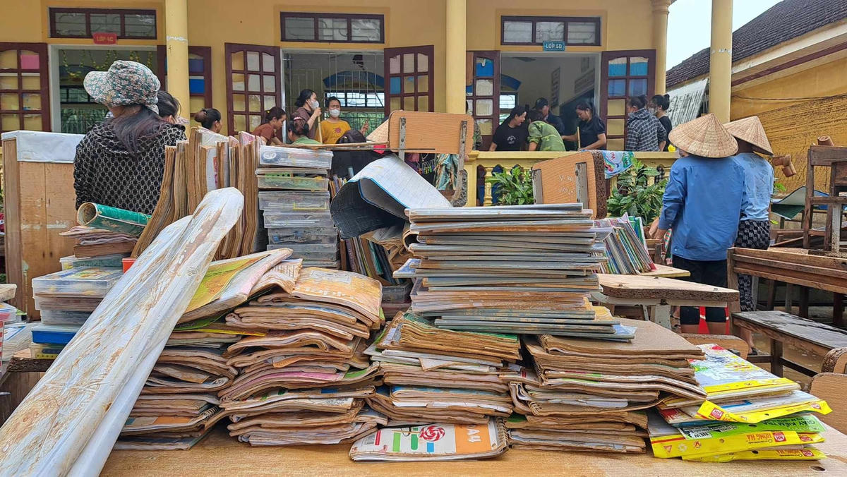 Sáng ngày 28/9, mưa giảm, nước rút nhiều công trình, hoa màu trên địa bàn huyện Quỳ Châu (Nghệ An) bị hư hỏng, tài sản của người dân chìm trong bùn đất, hàng ngàn cuốn sách, vở, đồ dùng học sinh lấm trong bùn đất.