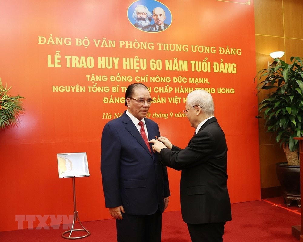 Chiều 29/9, tại Trụ sở Trung ương Đảng, Văn phòng Trung ương Đảng tổ chức Lễ trao Huy hiệu 60 năm tuổi Đảng tặng đồng chí Nông Đức Mạnh, nguyên Tổng Bí thư Ban Chấp hành TW Đảng Cộng sản Việt Nam.