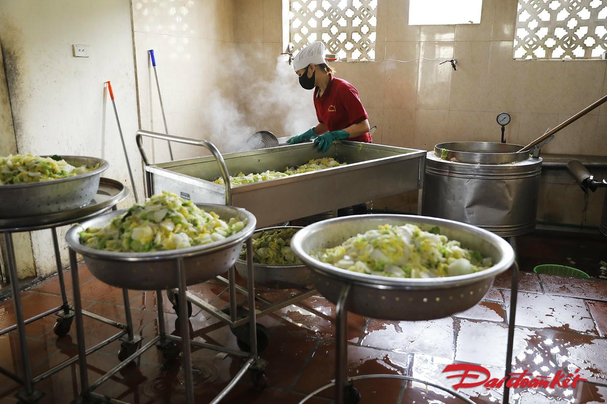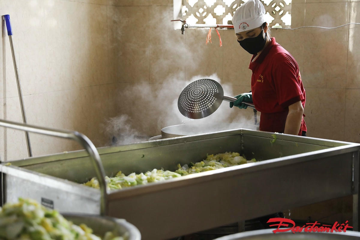 Bếp ăn phục vụ khu cách ly Trường Quân sự Bộ Tư lệnh Thủ đô phục vụ khoảng 1000 suất ăn, 3 bữa mỗi ngày. Theo đó, các nhân viên phục vụ trong bếp có thời gian làm việc kéo dài từ 3h sáng cho đến 7-8h tối mỗi ngày.