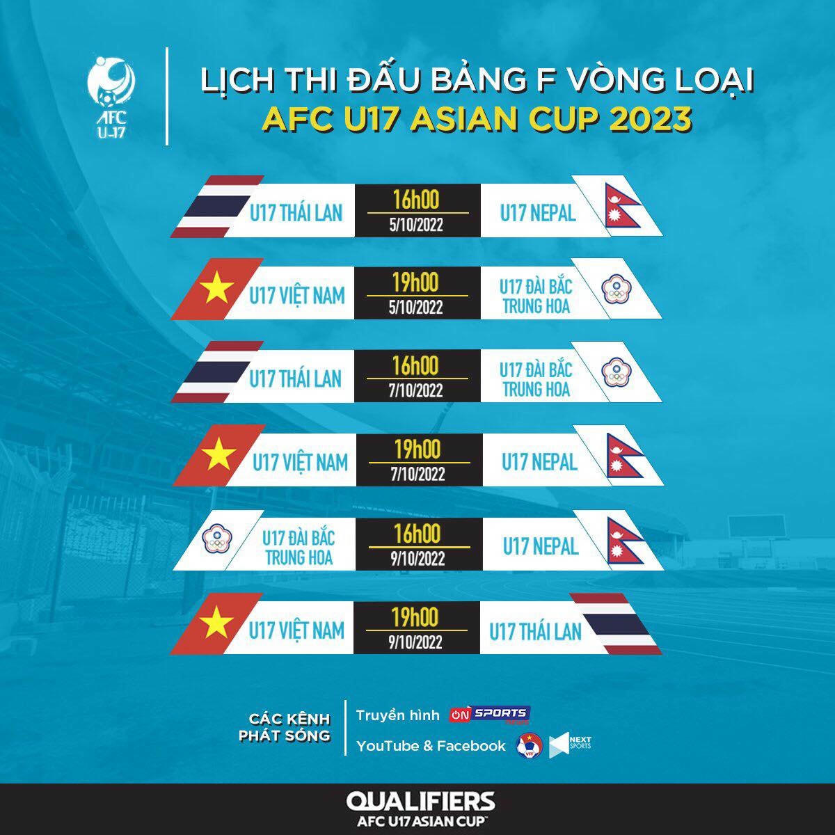 Các trận đấu của bảng F được đăng cai ở sân vận động Việt Trì (Phú Thọ). U17 Việt Nam sẽ đá trận ra quân gặp U17 Đài Loan (Trung Quốc) vào 19h tối 5/10. Trước đó, U17 Thái Lan đấu U17 Nepal lúc 16h.