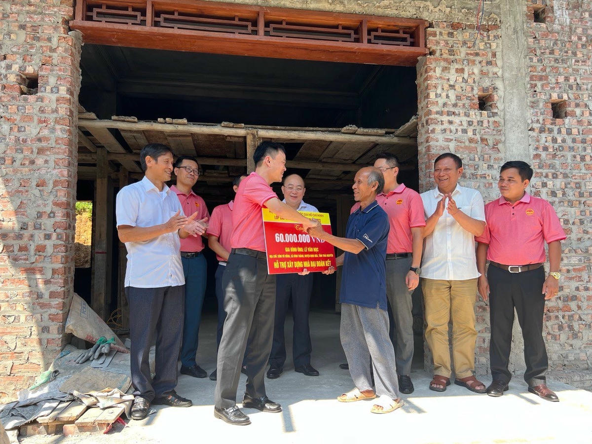 Tại căn nhà đang xây dựng, sắp hoàn thiện những khâu cuối cùng để khánh thành trong tháng 9/2023, đại diện Học viện Chính trị quốc gia Hồ Chí Minh, Lớp cao cấp lý luận chính trị K73B22 đã trao hỗ trợ cho gia đình (60 triệu đồng).
