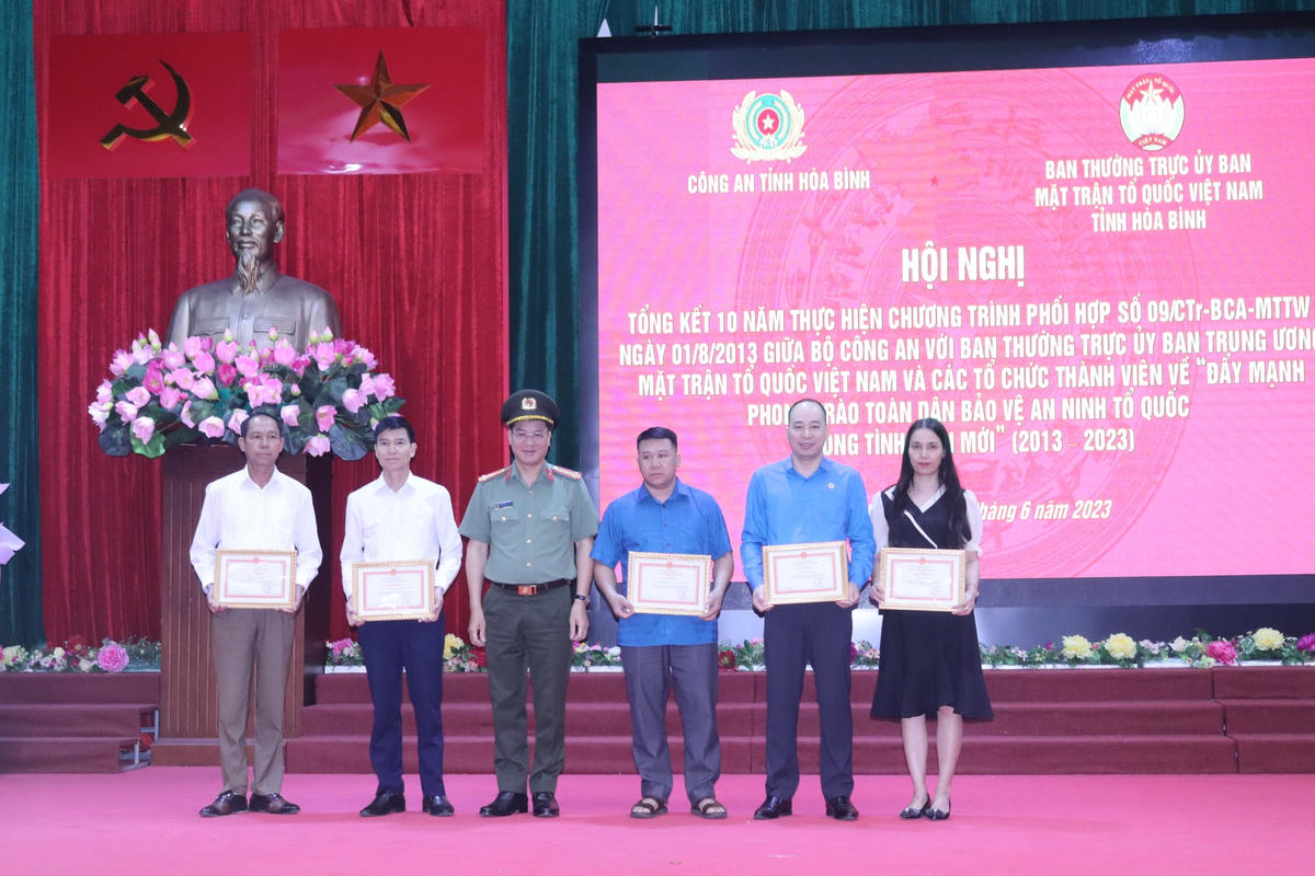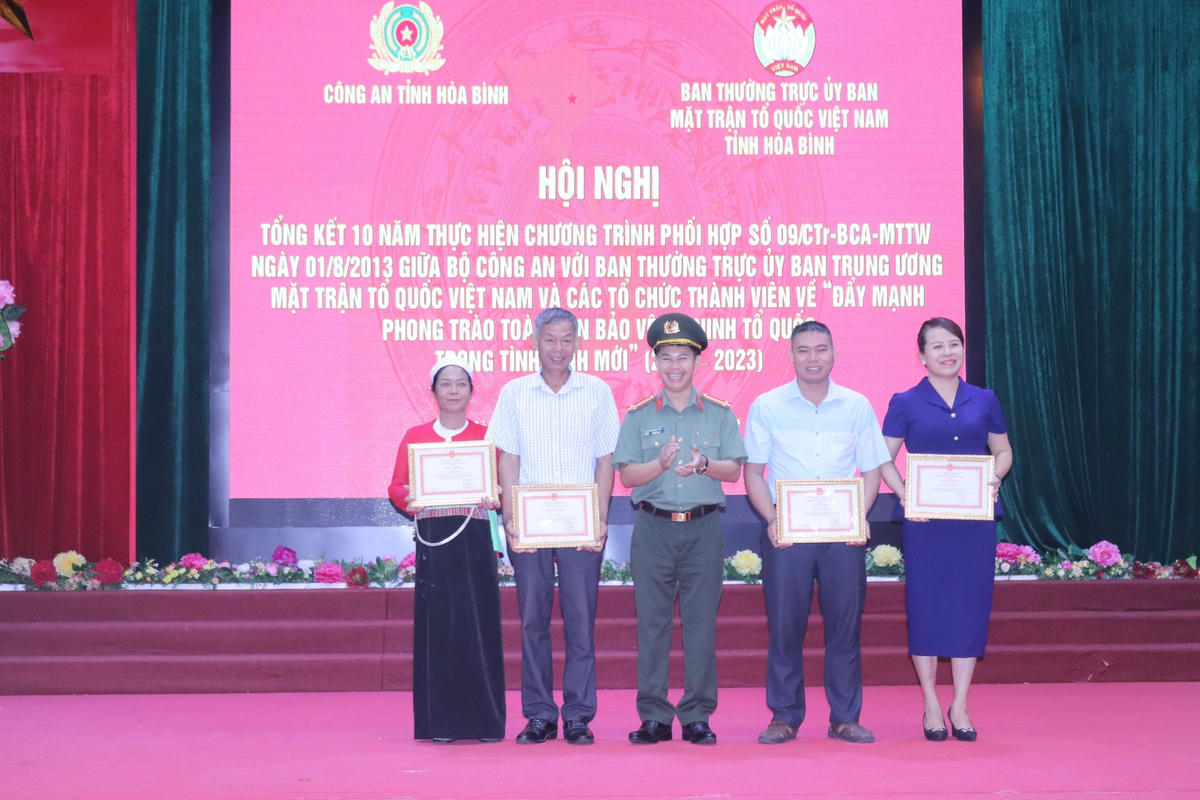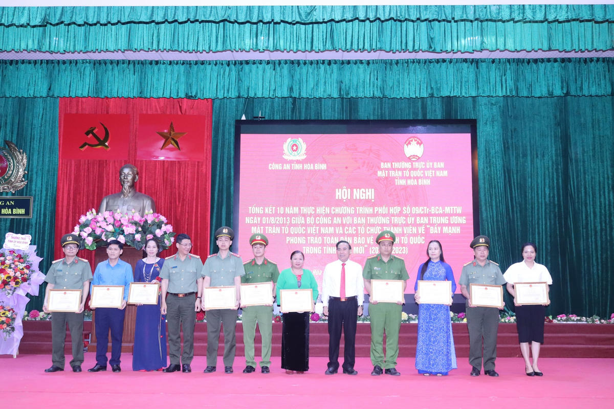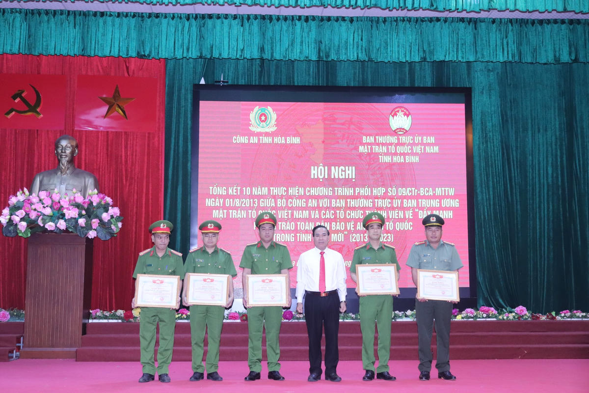 Nhân hội nghị này, Chủ tịch UBND tỉnh Hòa Bình đã trao tặng bằng khen cho 4 tập thể và 10 cá nhân, Công an tỉnh và Ủy ban MTTQ tỉnh trao bằng khen cho 10 tập thể, 10 cá nhân có thành tích xuất sắc trong thực hiện Chương trình phối hợp số 09/CTr-BCA-MTTW về “Đẩy mạnh phong trào Toàn dân bảo vệ an ninh Tổ quốc trong tình hình mới”.