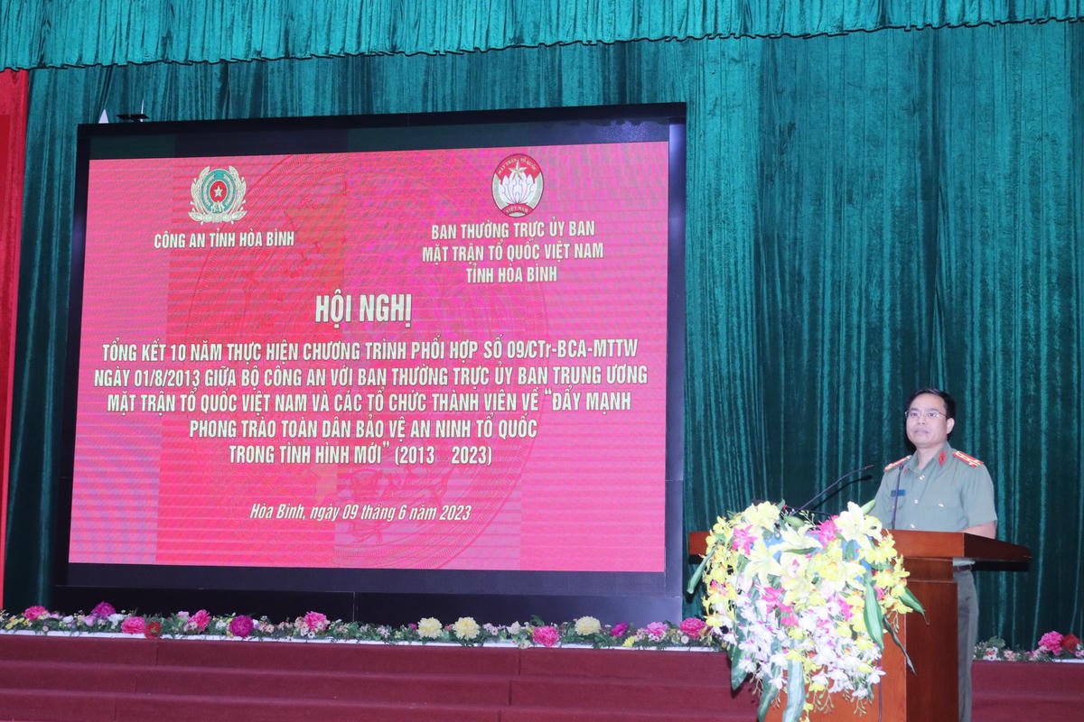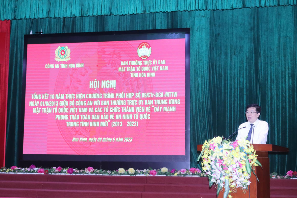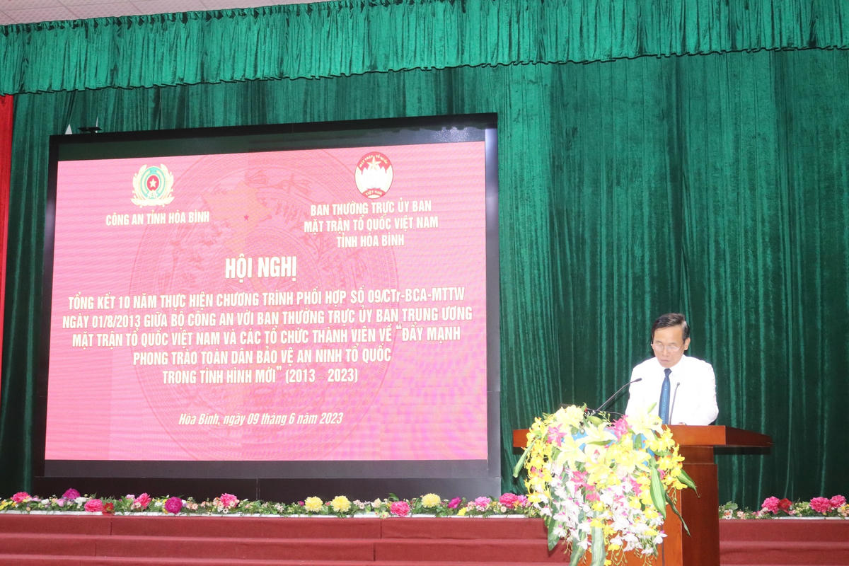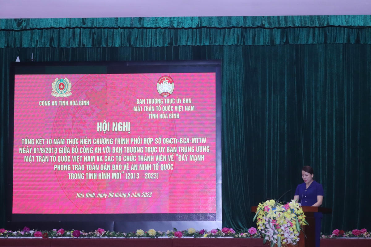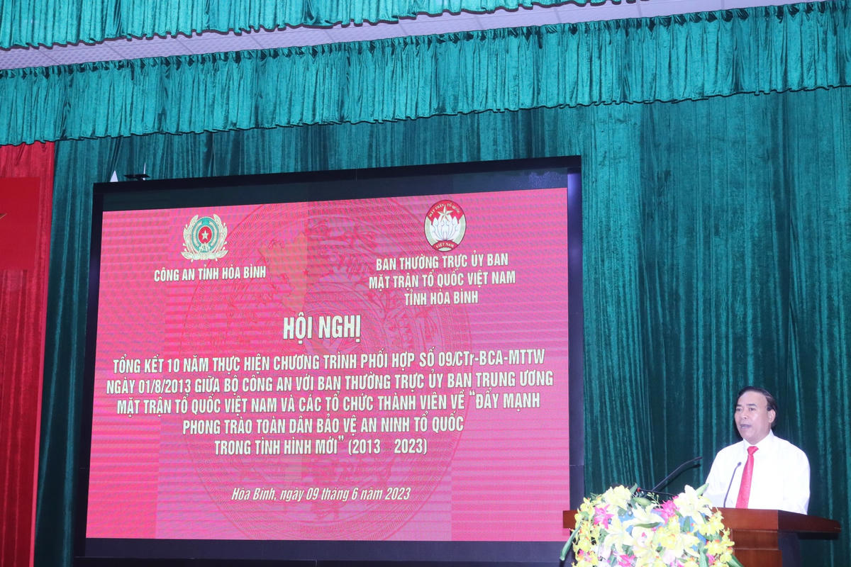 Ngày 9/6, Uỷ ban MTTQ tỉnh Hòa Bình vừa cùng với Công an tỉnh tổ chức Hội nghị tổng kết 10 năm thực hiện Chương trình phối hợp số 09/CTr-BCA-MTTW ngày 1/8/2013 giữa Bộ Công an với Ban Thường trực Ủy ban Trung ương Mặt trận Tổ quốc Việt Nam và các tổ chức thành viên về “Đẩy mạnh phong trào toàn dân bảo vệ an ninh Tổ quốc trong tình hình mới” (2013 - 2023).