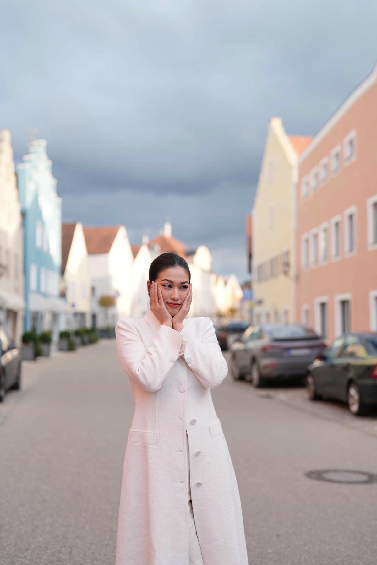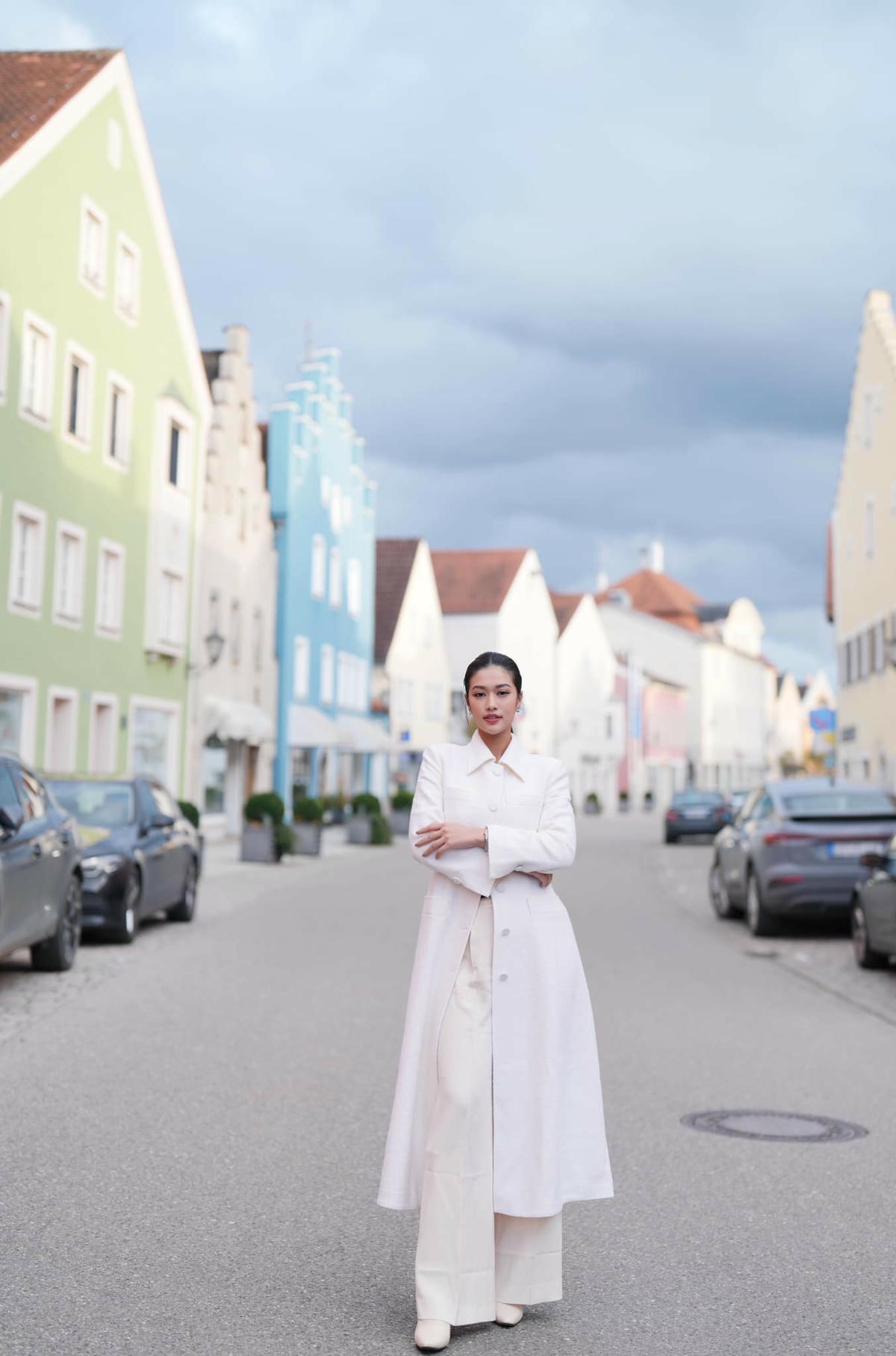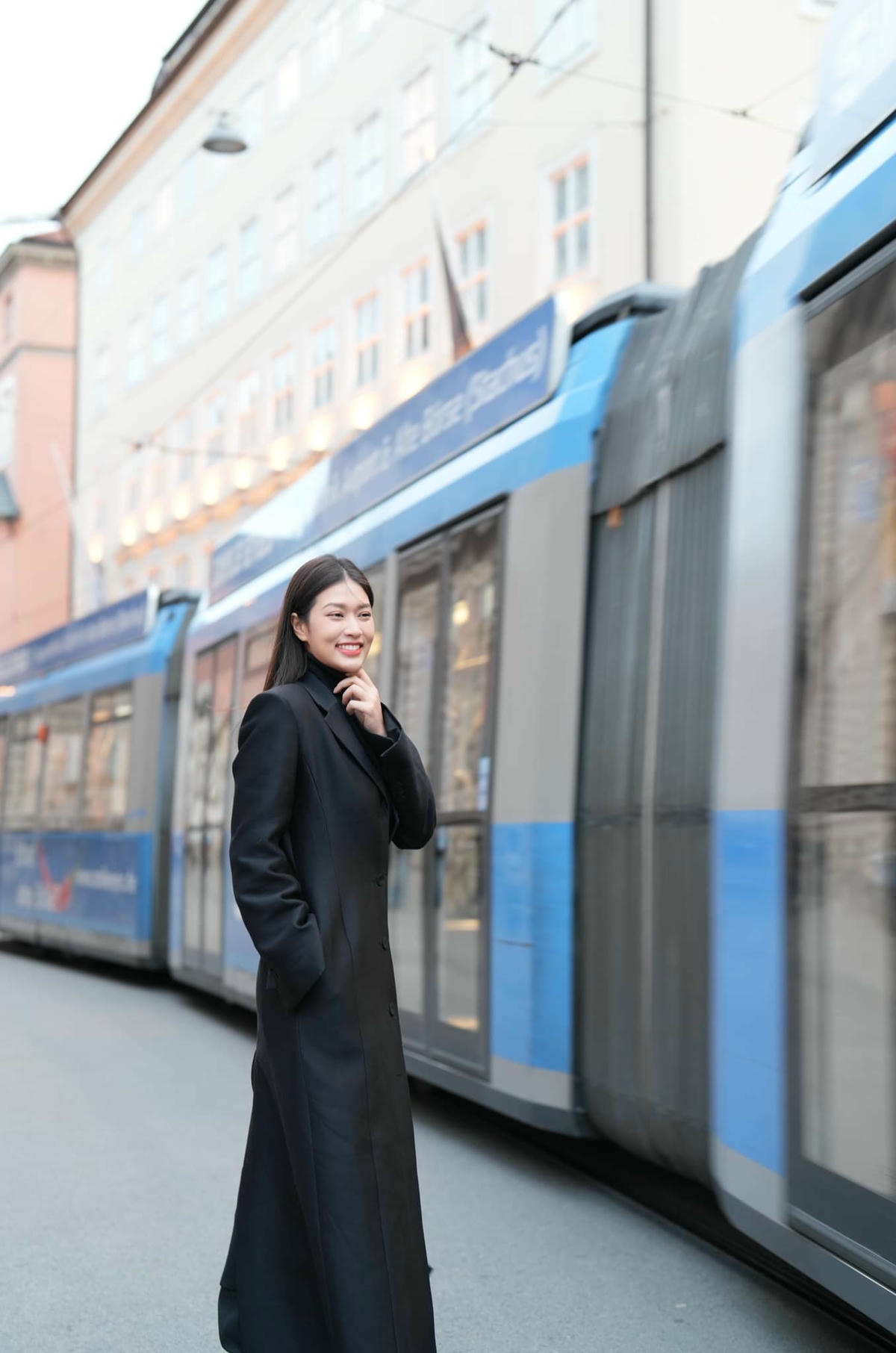 Hoa hậu Đoàn Thiên Ân diện thiết kế áo khoác dáng dài tại trời Âu