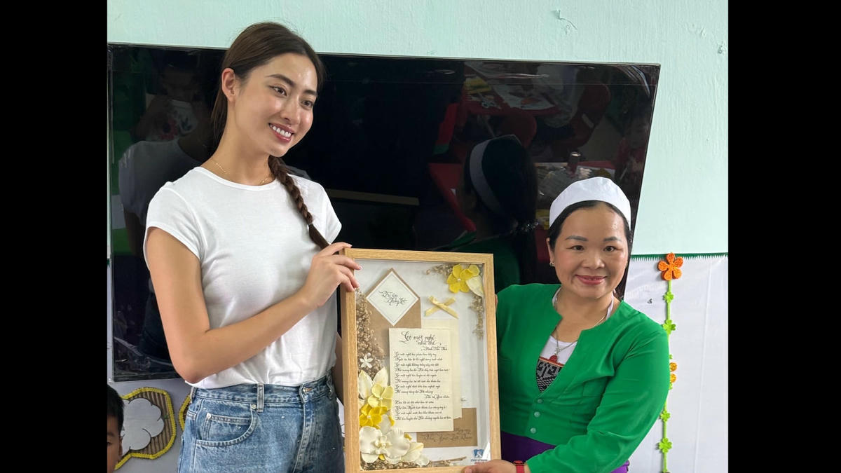 Thấu hiểu những khó khăn cũng như tri ân sự nhiệt huyết của các thầy trò vùng núi, đại diện cho chương trình - Lương Thùy Linh đã trao tặng quà cho các thầy cô giáo và các em học sinh của trường. Bên cạnh đó, hoa hậu 23 tuổi cũng cùng các học sinh làm tấm thiệp ý nghĩa tặng thầy cô nhân dịp Ngày Nhà giáo Việt Nam 20-11.