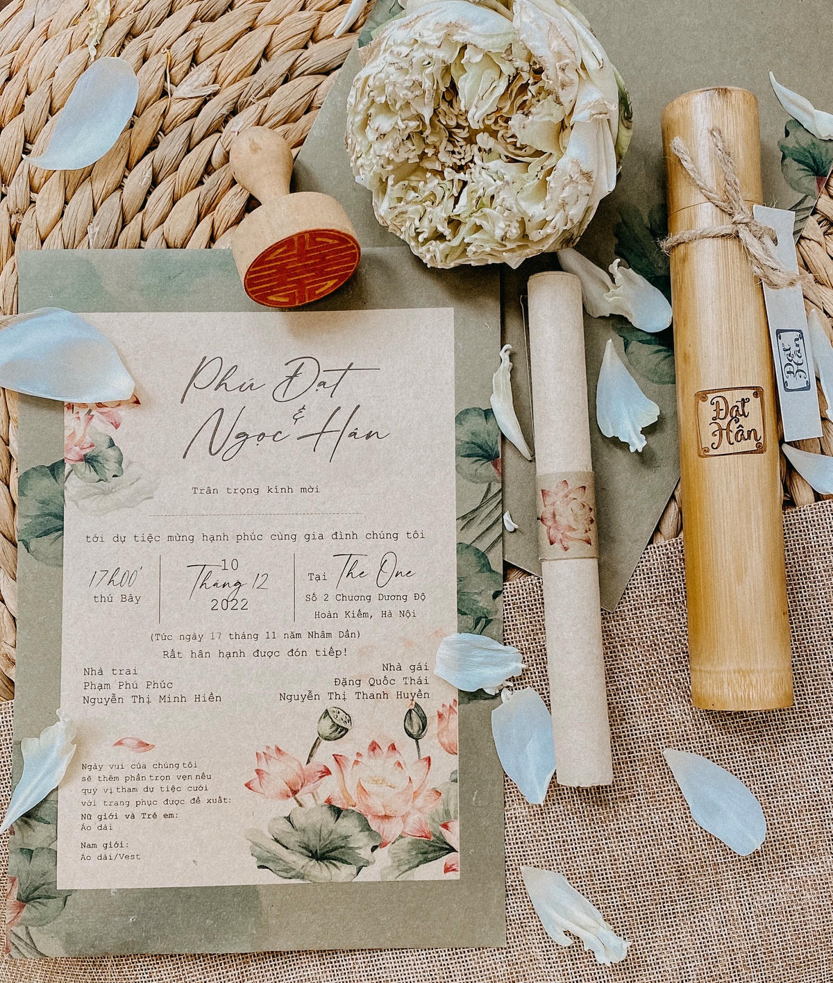 “Không phải tấm thiệp mà là cây thiệp. Không phải giấy thường mà là giấy dó. Không phải phong bao mà là ống tre. Trên ống tre còn tỉ mỉ khắc logo được cách điệu từ dấu triện. Đặc biệt, hình ảnh hoa sen vốn đã gắn liền với những thiết kế áo dài của Hân nay lại được khoe sắc trên bộ thiệp cưới đượm màu dân tộc”, hoa hậu Ngọc Hân bật mí về điều đặc biệt ở hôn lễ của mình.