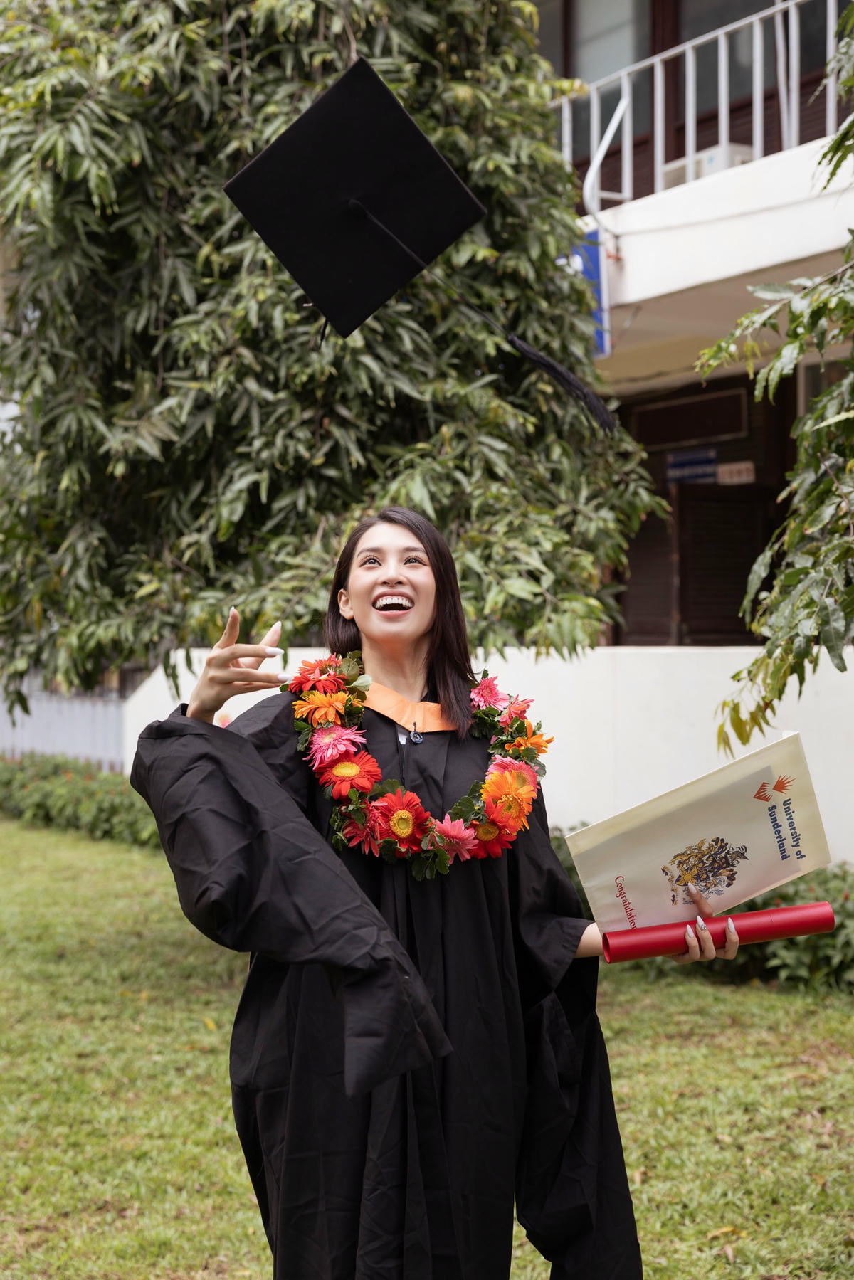 Với lịch trình bận rộn, Tiểu Vy vẫn tích cực theo học và hoàn thành các chương trình của trường. Tại buổi lễ tốt nghiệp nàng Hậu đã đại diện cho các tân cử nhân để gửi những lời cảm ơn đến trường bằng tiếng Anh.