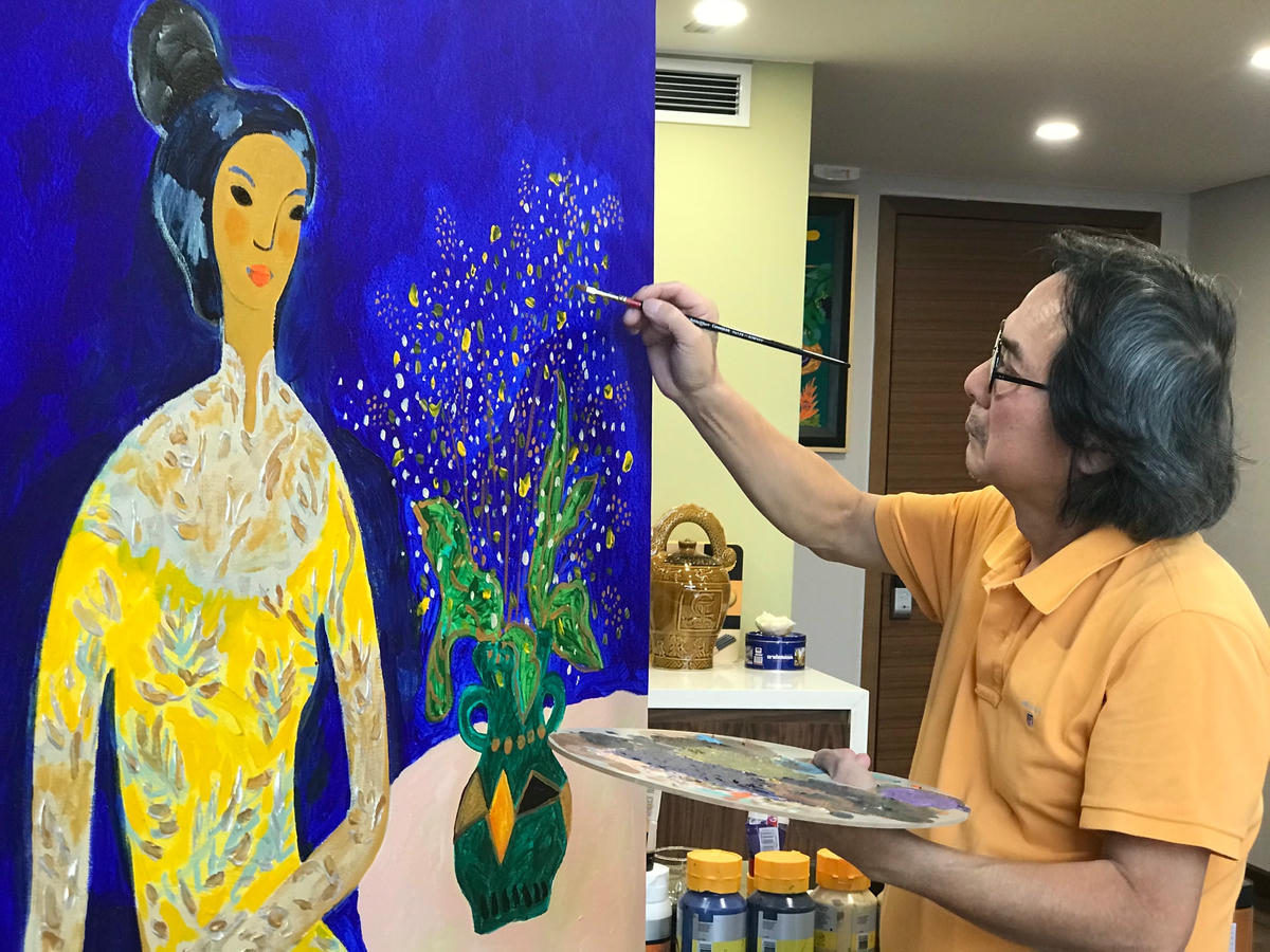Họa sĩ quyết định mang về ngôi trường cũ những tác phẩm hội họa tâm đắc và mới nhất. Bên cạnh những sáng tác trong nhiều giai đoạn sáng tác suốt 50 năm qua, nhiều tranh phải mượn lại từ các nhà sưu tập để trưng bày, còn có khoảng 20 tác phẩm chưa công bố, họa sĩ vừa hoàn thành trong thời gian gần đây (cuối 2022, đầu 2023), tại Hà Nội. Những tác phẩm này được sáng tác trên các chất liệu: sơn mài, sơn dầu, acylic.
