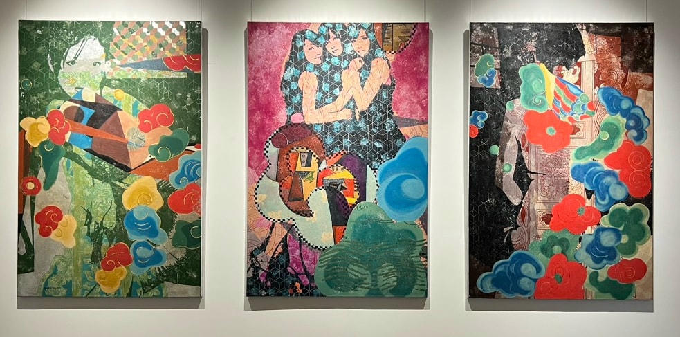 Trong triển lãm lần này, họa sĩ đã thử sức với 2 bức tranh hình tròn có đường kính 2,7m. Đây không phải lần đầu anh vẽ trên hình tròn, nhưng kích thước lớn như vậy là một thử thách. Ngoài hai bức tròn khổ lớn, còn có những bức cao 2m, dài hơn 5m, còn lại là 1,25m x 1,94m.