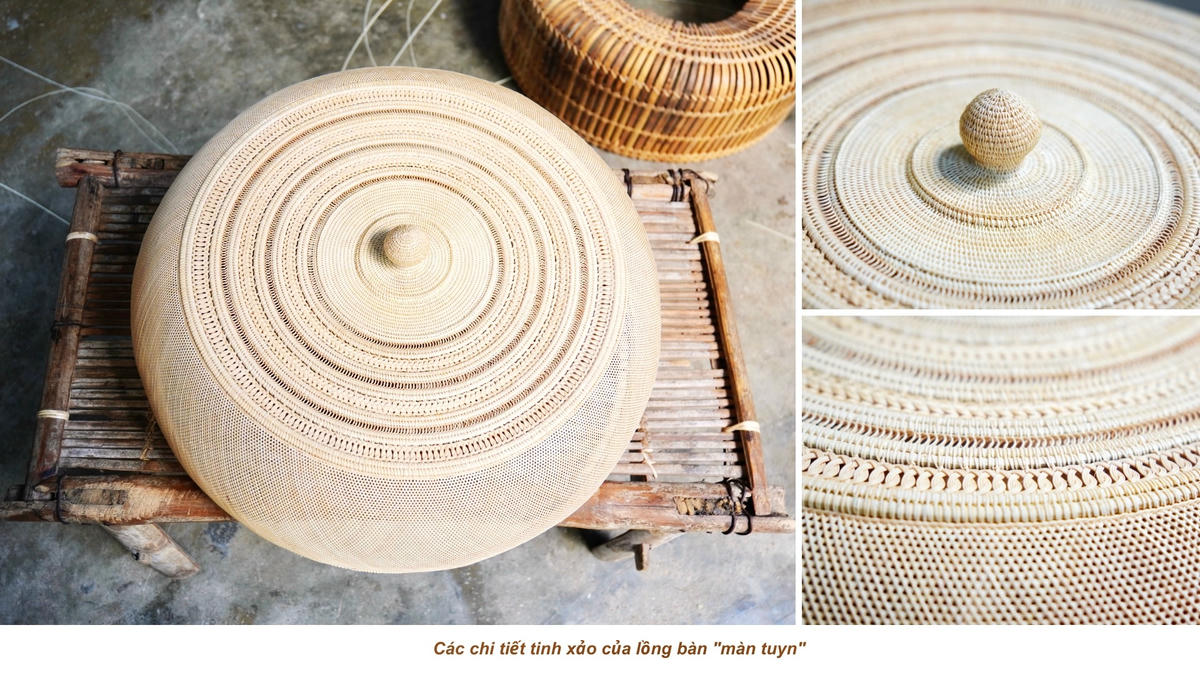 Chiếc lồng bàn của gia đình ông bà còn được ví như chiếc màn tuyn bởi màu sắc trắng ngà của mây cùng độ nhẹ chỉ khoảng 300g. Lồng bàn được trang trí bằng nhiều họa tiết thủ công do chính tay bà Tiến bện từng sợi mây nhỏ tạo thành.