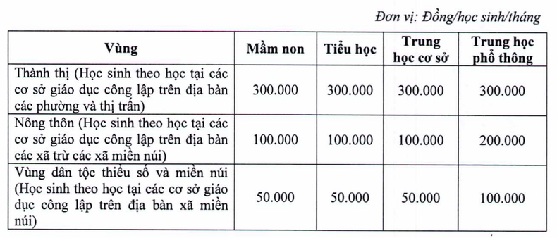 Cụ thể, ở khu vực thành thị, mức học phí cho học sinh cấp mầm non, tiểu học, THCS và THPT, GDNN-GDTX là 300 nghìn đồng/học sinh/tháng. Ở nông thôn, mức học phí cho học sinh cấp mầm non, tiểu học, THCS là 100 nghìn đồng/học sinh/tháng; cấp THPT, GDNN-GDTX là 200 nghìn đồng/học sinh/tháng.