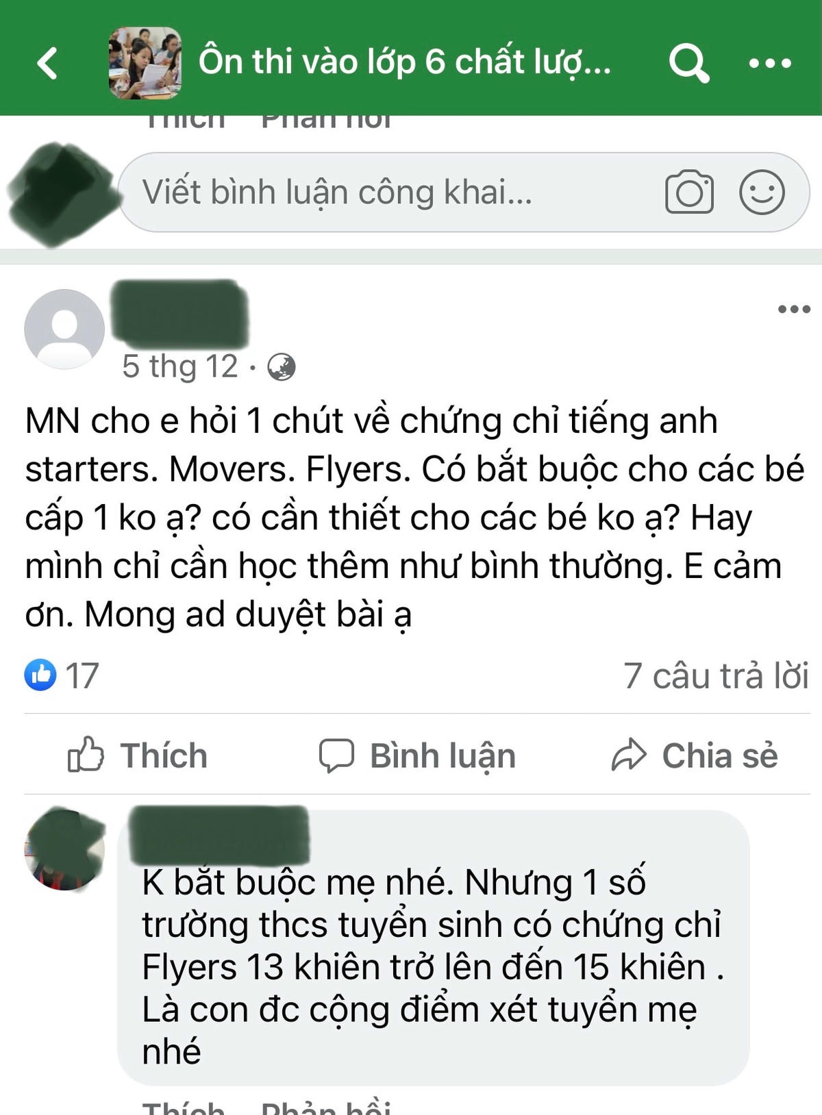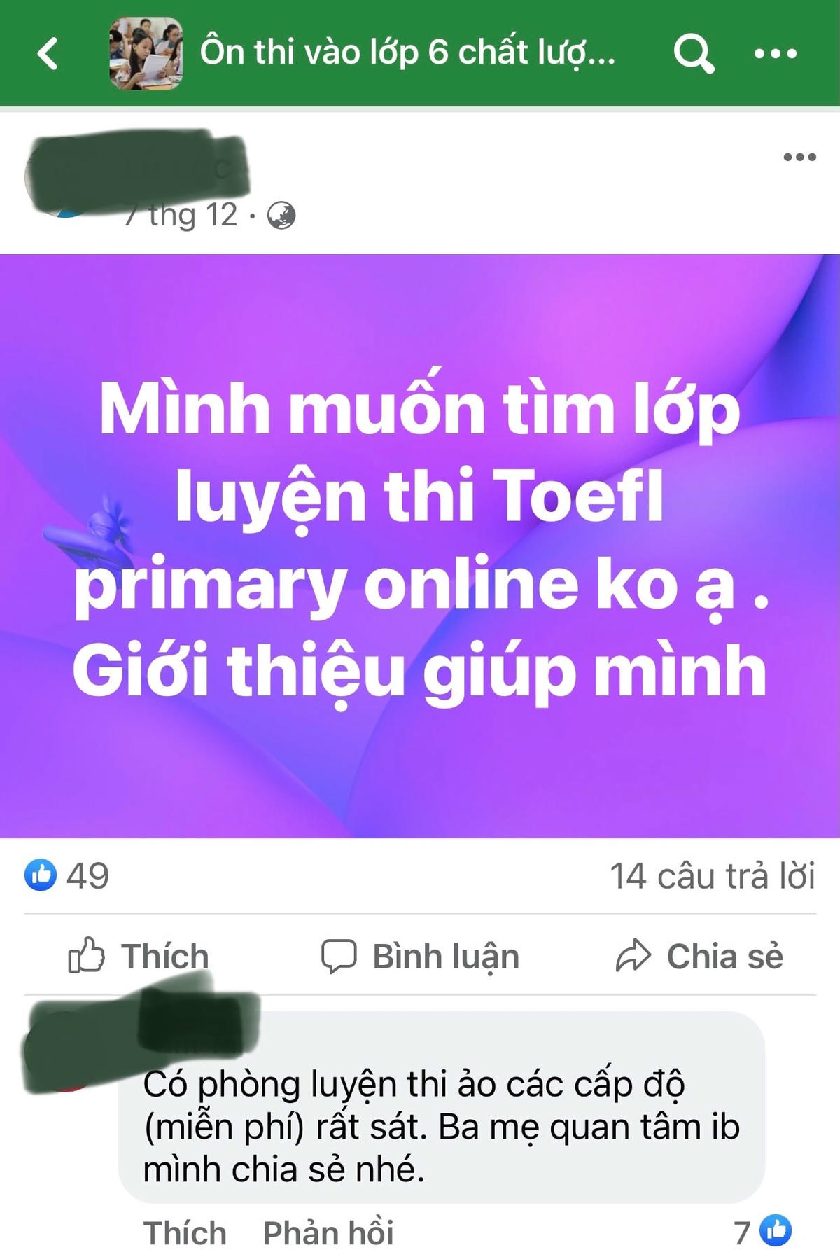 “Em muốn tìm lớp luyện thi TOEFL Primary cho bé lớp 4”, “Mọi người cho em hỏi về chứng chỉ tiếng Anh Starters, Movers, Flyers có bắt buộc với các bé cấp 1 không?”, “Giới thiệu giúp tôi lớp luyện thi TOEFL Primary online cho bé”,… Không khó tìm kiếm nhưng nội dung như thế này trên một group dành cho phụ huynh có con chuẩn bị thi vào lớp 6 chất lượng cao trên mạng xã hội Facebook.