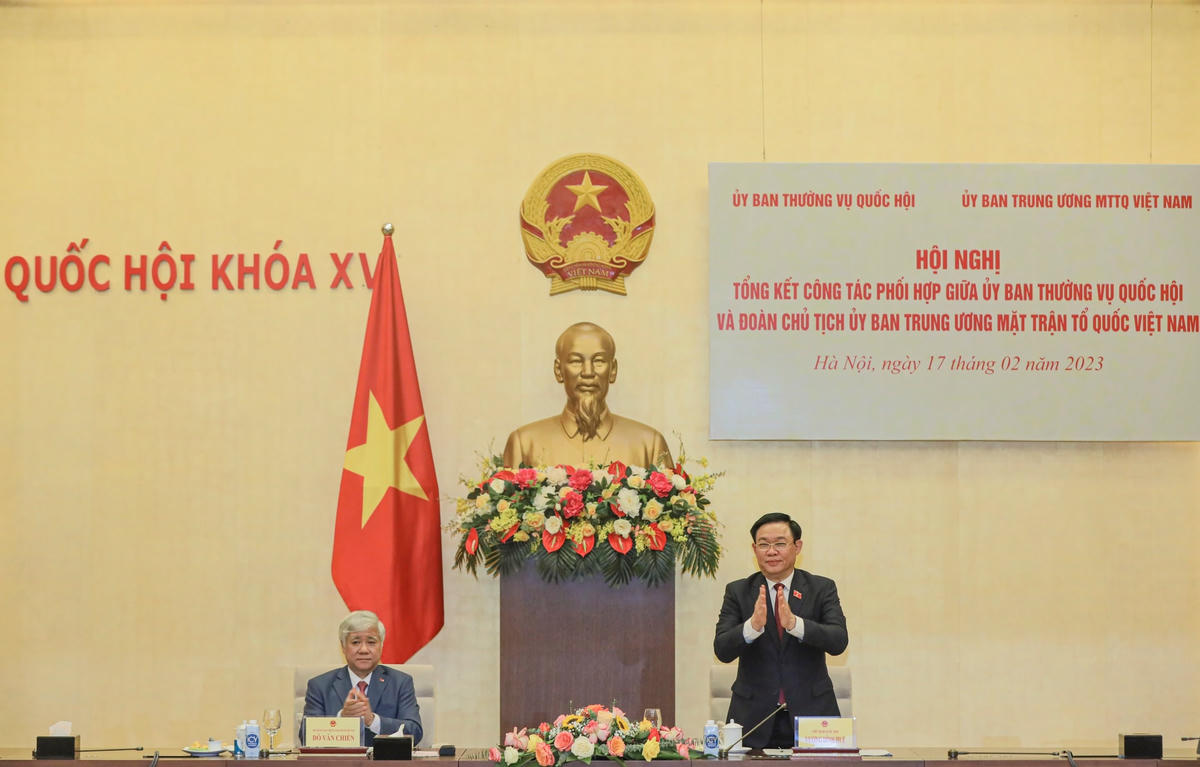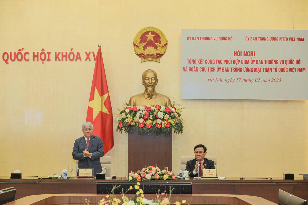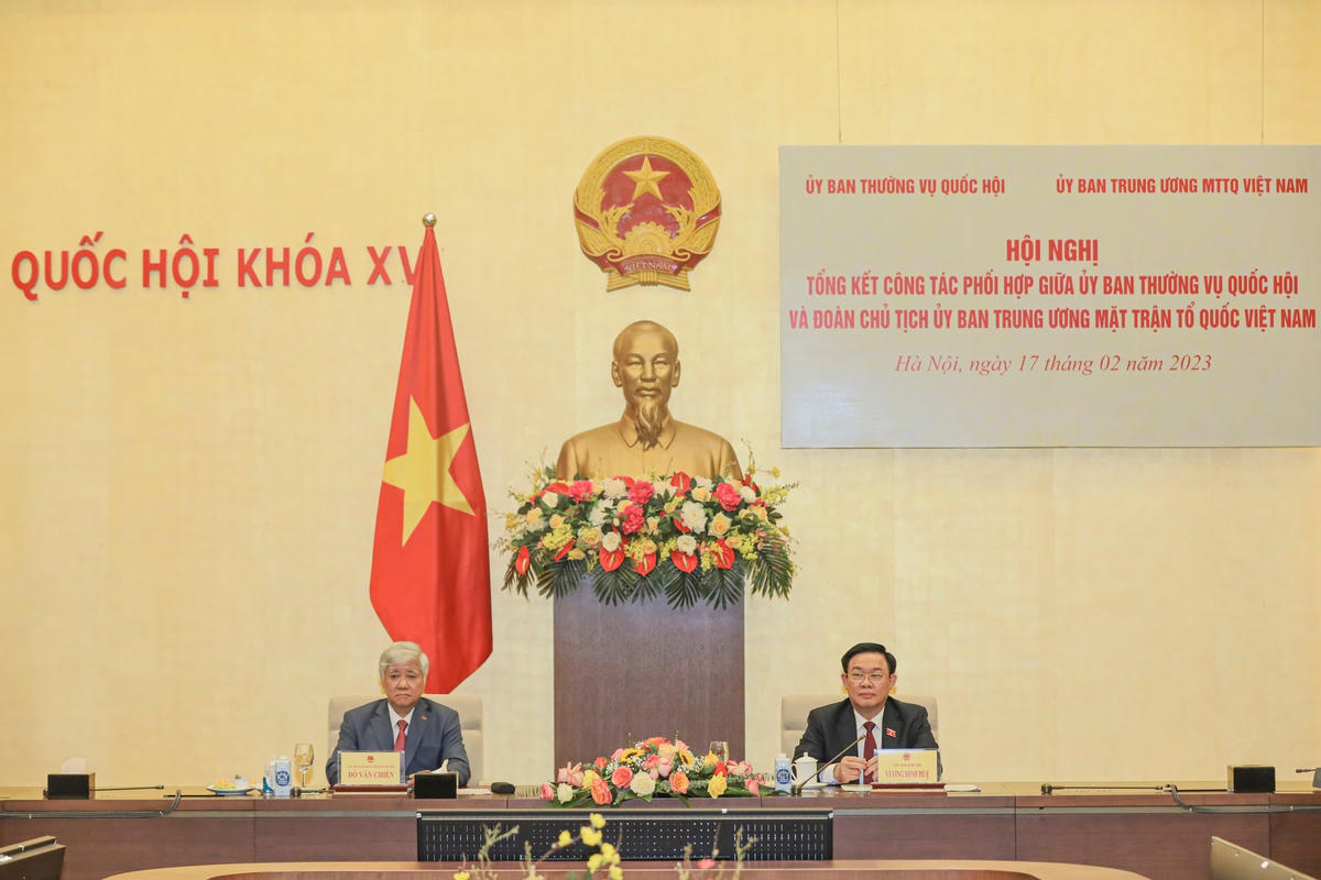 Ngày 17/2, tại tòa nhà Quốc hội, Ủy viên Bộ Chính trị, Chủ tịch Quốc hội Vương Đình Huệ và Bí thư Trung ương Đảng, Chủ tịch UBTƯ MTTQ Việt Nam Đỗ Văn Chiến đã chủ trì Hội nghị liên tịch thường niên tổng kết công tác phối hợp giữa Ủy ban Thường vụ Quốc hội và Đoàn Chủ tịch UBTƯ MTTQ Việt Nam nhằm tổng kết công tác phối hợp năm 2022, trọng tâm công tác phối hợp năm 2023.