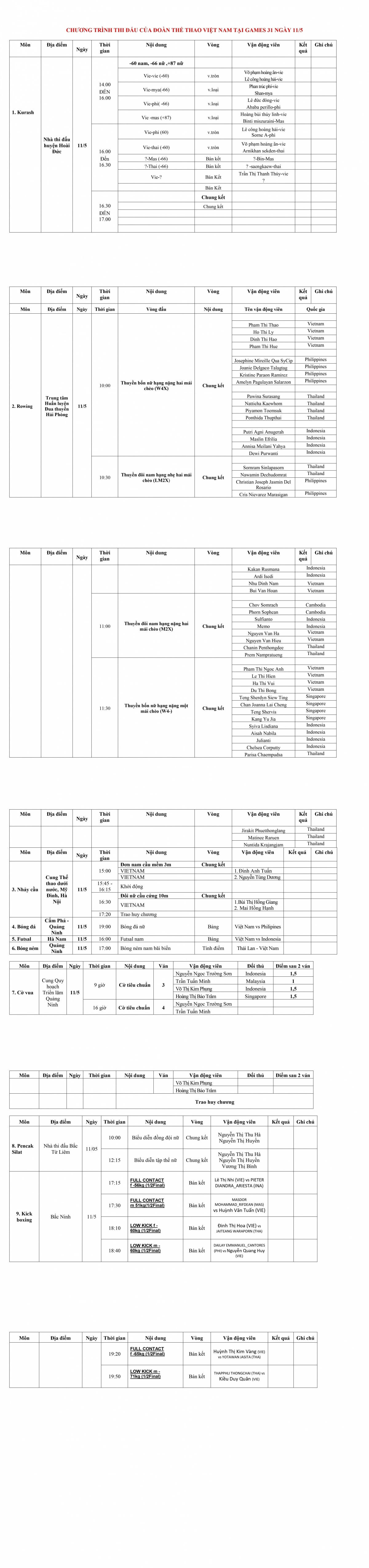 Hôm nay (11/5), Đoàn Thể thao Việt Nam tại SEA Games 31 sẽ tranh tài ở các môn Kurash, Rowing, Nhảy cầu, Bóng đá nữ, Futsal, Bóng ném bãi biển, Cờ vua, Pencak Silat và Kick boxing.