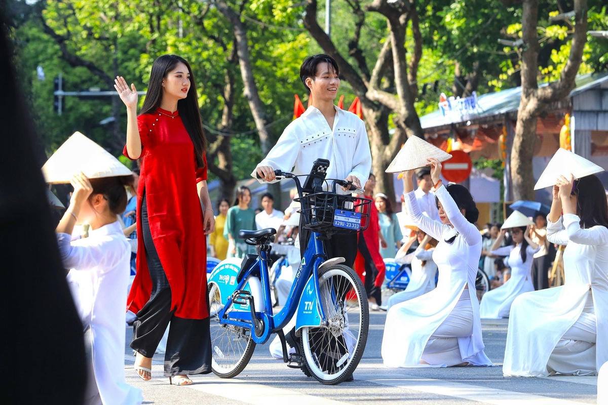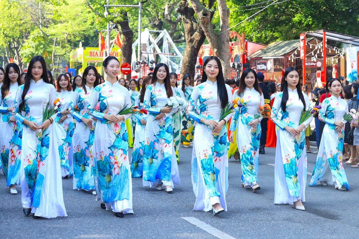 Đoàn diễu hành của Câu lạc bộ Văn hóa Áo dài với vẻ đẹp thướt tha của những tà áo dân tộc; đoàn diễu hành của doanh nghiệp du lịch Hà Nội.