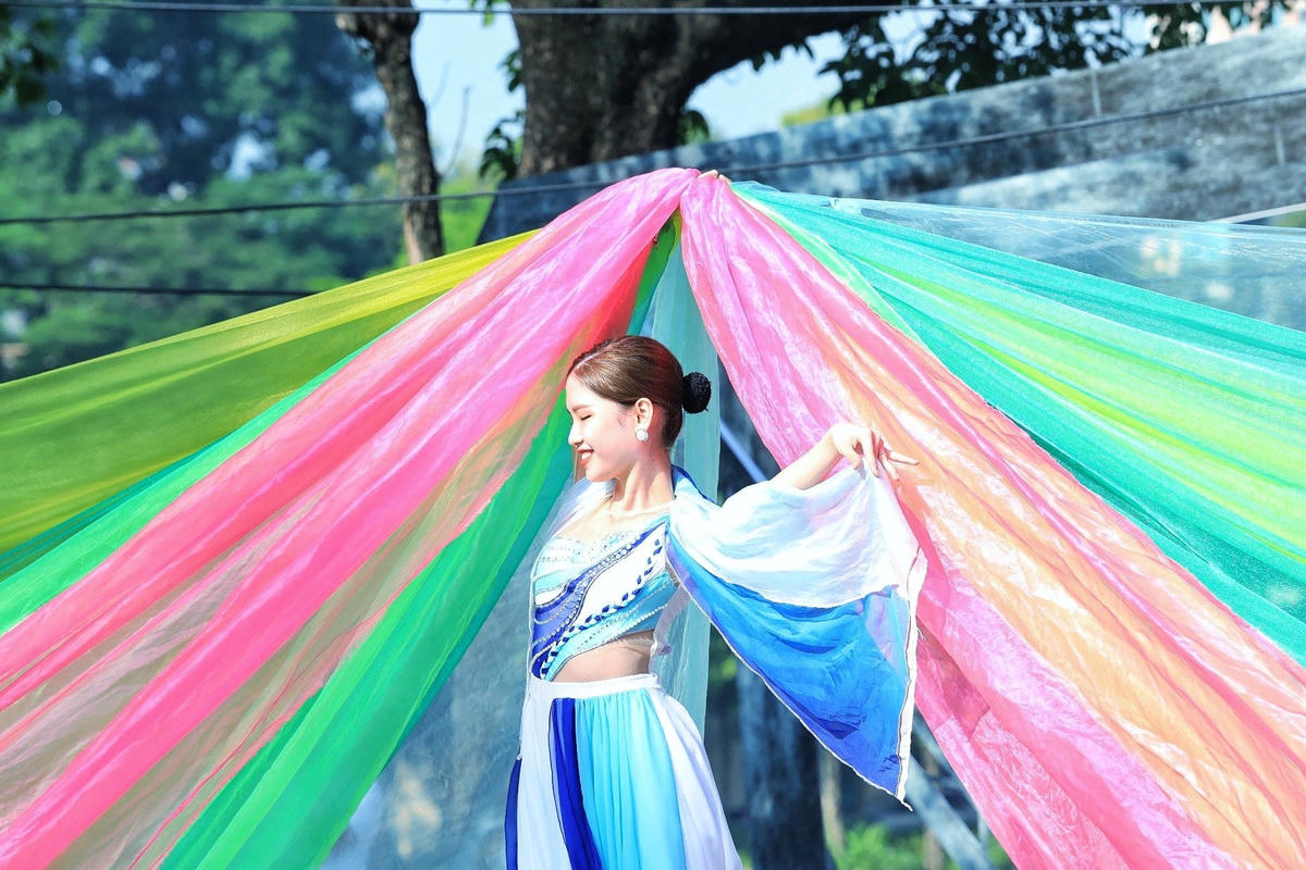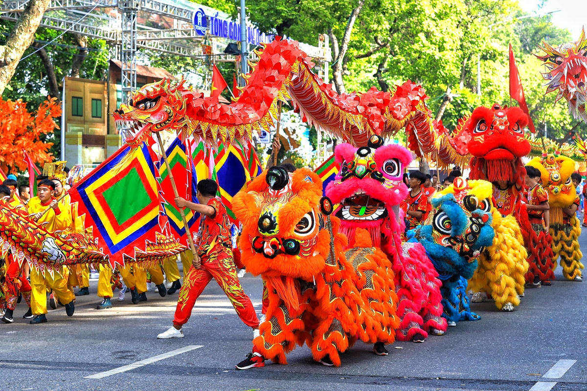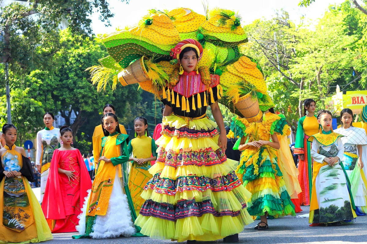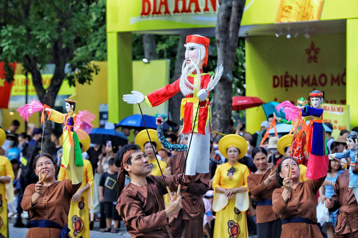 Cùng với đó là các đoàn diễu hành giới thiệu nghệ thuật rối cạn của huyện Mỹ Đức, diều sáo của huyện Đông Anh, đoàn biểu diễn nghệ thuật đường phố, biểu diễn trang phục dân tộc, múa nghệ thuật “Vũ điệu trên mây.”
