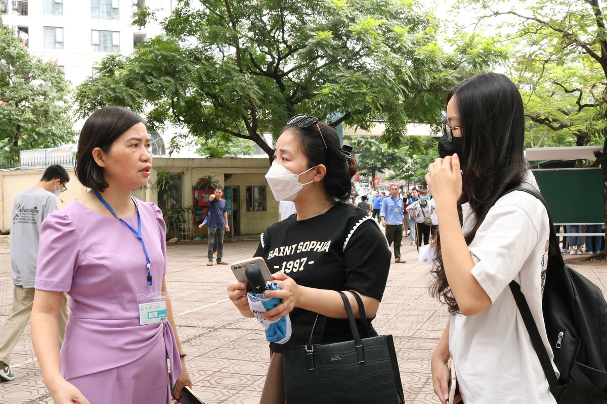 Thí sinh và phụ huynh tra thông tin phòng thi tại điểm thi Trường THPT Nguyễn Trãi - Ba Đình.Toàn thành phố có 201 điểm thi. Số cán bộ, giáo viên làm công tác coi thi, chấm thi là 20.000 người.Ngoài ra còn có 590 cán bộ giám sát tại các điểm thi và hơn 1.000 cán bộ, chiến sĩ công an thực hiện nhiệm vụ bảo vệ khu vực thi. 100% các điểm thi cam kết bảo đảm mọi điều kiện về cơ sở vật chất theo quy định.Theo ghi nhận của phóng viên tại điểm thi Trường THPT Nguyễn Trãi, mọi điều kiện về cơ sở vật chất được chuẩn bị đầy đủ, bảo đảm theo quy định.Cán bộ coi thi kiểm tra thông tin thí sinh trước khi vào phòng thi.Trao đổi với phóng viên, bà Phạm Thị Ngọc - Phó trưởng điểm thi phụ trách cơ sở vật chất điểm thi Trường THPT Nguyễn Trãi Ba Đình cho biết, điểm thi có 25 phòng thi với 600 thí sinh và 55 cán bộ coi thi. Nhà trường chuẩn bị đầy đủ các điều kiện về cơ sở vật chất đáp ứng mọi yêu cầu của kỳ thi. Công tác chuẩn bị phương án dự phòng, hỗ trợ thí sinh khi cần thiết cũng được nhà trường lên phương án đầy đủ.Cán bộ coi thi phổ biến quy chế thi.Năm nay là năm thành phố có số lượng thí sinh thi vào lớp 10 tăng cao. Trước lo lắng của phụ huynh và thí sinh, bà Ngọc đưa lời khuyên, thí sinh nên bình tĩnh, giữ gìn sức khỏe để làm bài thi đạt kết quả tốt nhất.Phụ huynh đón con tại ngoài điểm thi.Kỳ thi chính thức bắt đầu vào sáng mai (10/6) với môn thi đầu tiên là Ngữ văn, buổi chiều thí sinh dự thi môn Ngoại ngữ. Sáng 11/6, thí sinh thi môn cuối cùng là Toán.