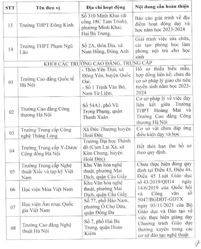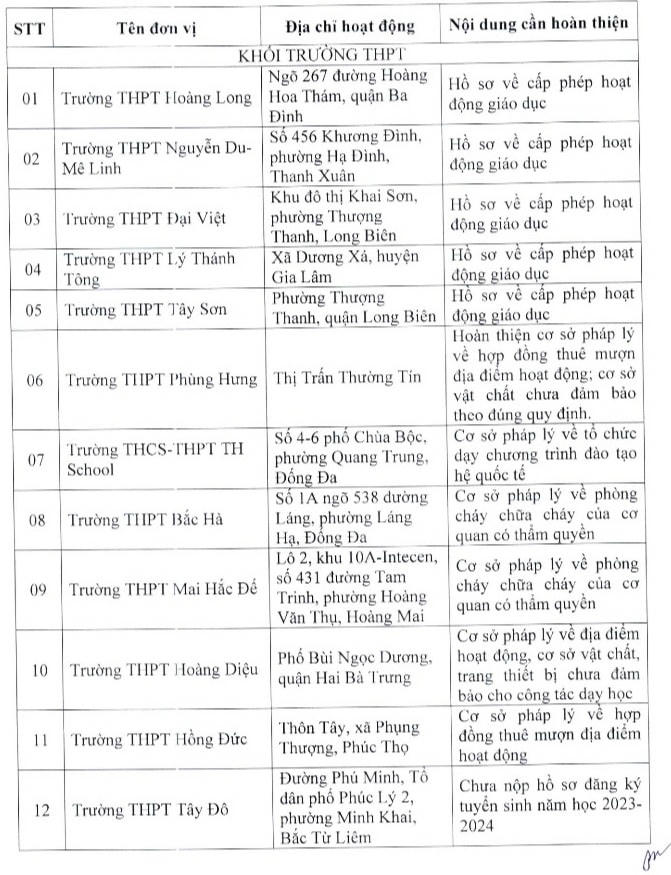 Thông báo cũng yêu cầu các trường cần hoàn thiện như: Cơ sở vật chất, trang thiết bị; hồ sơ đăng ký tuyển sinh năm học 2023-2024 chưa có báo cáo giải trình về địa điểm hoạt động dạy và học; hồ sơ cấp phép hoạt động giáo dục; điều kiện cơ sở pháp lý về hợp đồng thuê mượn địa điểm hoạt động; cơ sở pháp lý về tổ chức dạy chương trình đào tạo hệ quốc tế; cơ sở pháp lý về phòng cháy, chữa cháy của cơ quan có thẩm quyền...