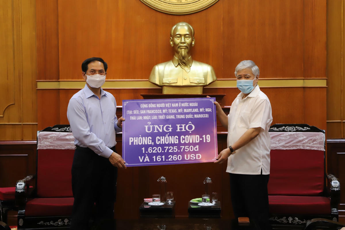 Cũng theo Bộ trưởng Bùi Thanh Sơn, tính đến ngày 16/6/2021, bà con kiều bào đã ủng hộ số tiền ủng hộ đợt 1 tương đương khoảng 5,3 tỷ đồng cho công tác phòng, chống dịch và Quỹ vaccine phòng, chống Covid-19; trong đó, cộng đồng người Việt Nam tại Nhật Bản: 20.000 USD; cộng đồng người Việt Nam tại Liên bang Nga: 11.260 USD; cộng đồng người Việt Nam tại khu vực San Francisco: 55.000 USD, Maryland: 50.000 USD, Texas: 25.000 USD; cộng đồng người Việt Nam tại cộng hòa Séc ủng hộ 500 triệu đồng; cộng đồng người Việt Nam tại Thái Lan 450 triệu đồng; cộng đồng người Việt Nam tại một số tỉnh, thành phố của Trung Quốc (Thượng Hải, Giang Tô, Triết Giang): 201.600.000 đồng; cộng đồng người Việt Nam tại Morocco: 10.285.750 đồng; Công ty Petro Trade PTL Holding (Lào): 458.840.000 đồng... và nhiều vật phẩm y tế hỗ trợ y bác sĩ và người dân các địa phương.
