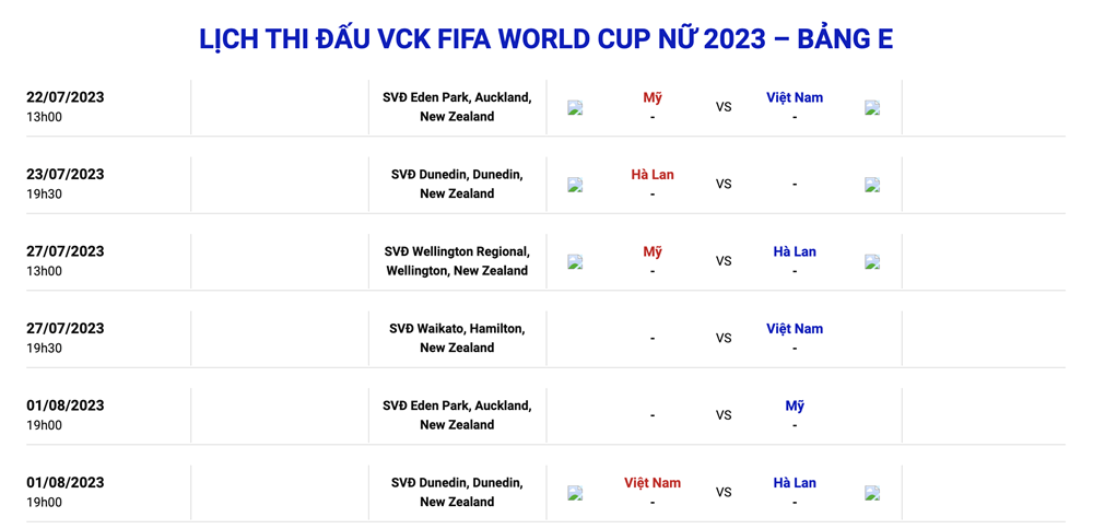 Theo TTXVN, đội tuyển nữ Việt Nam đá trận đầu tiên vòng bảng với Mỹ vào ngày 22/7/2023 trên sân vận động Eden Park tại thành phố Auckland. Sau đó, đội tuyển thi đấu trận tiếp theo vào ngày 27/7/2023 trên sân thi đấu Waikato thuộc thành phố Hamilton. Còn lại, lượt trận cuối cùng vòng bảng diễn ra tại sân vận động Forsyth Barr ở thành phố Dunedin vào ngày 1/8/2023.